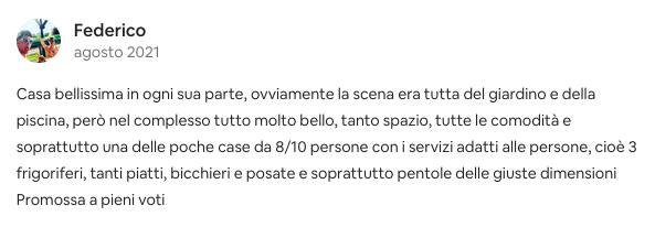 Ogni angolo della villa è curato, ma il giardino con piscina è davvero il punto forte. Spazi ampi, comfort ben pensati e dotazioni rare per gruppi numerosi: tre frigoriferi, molte stoviglie e pentole adatte per 8-10 persone. Un soggiorno impeccabile.
