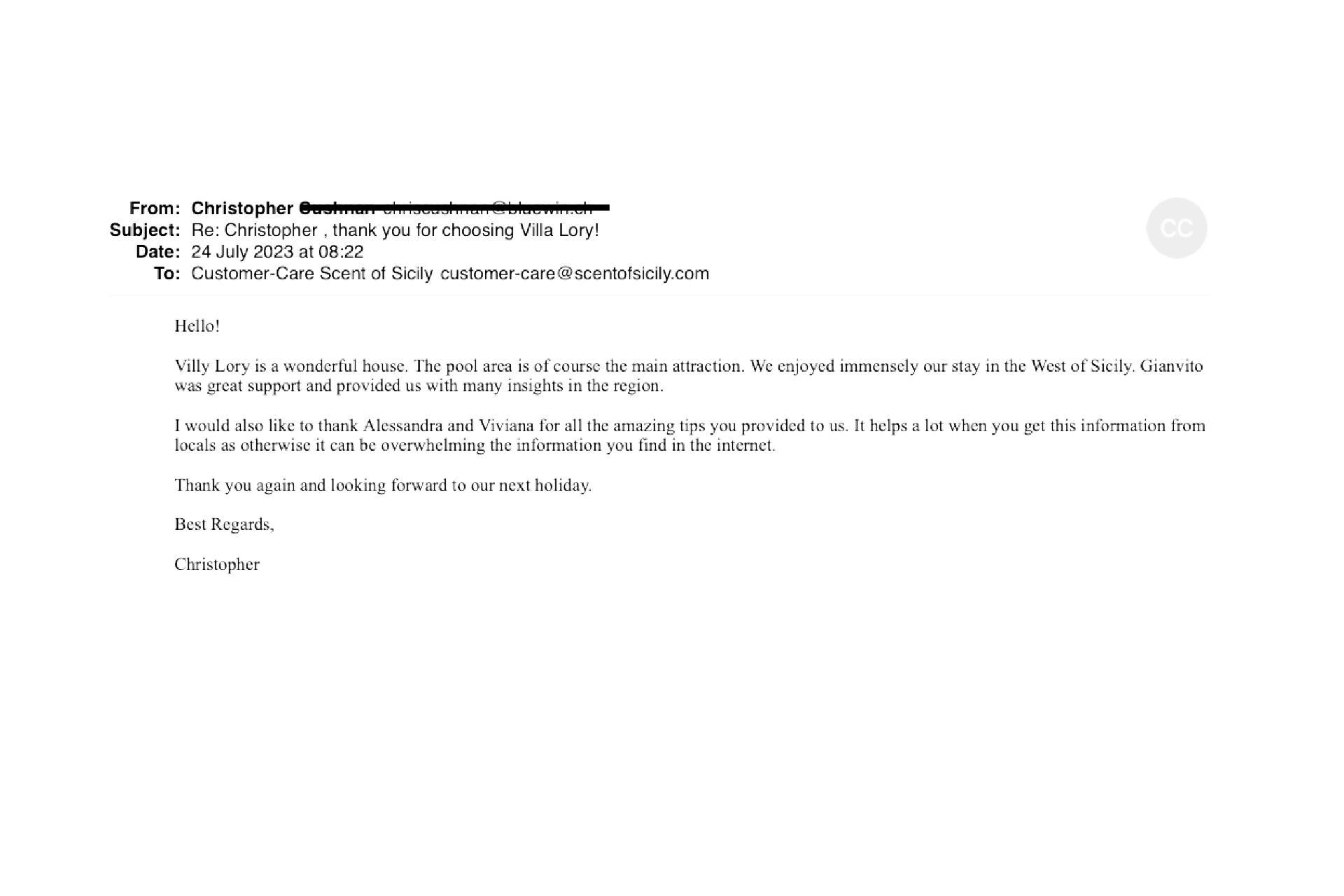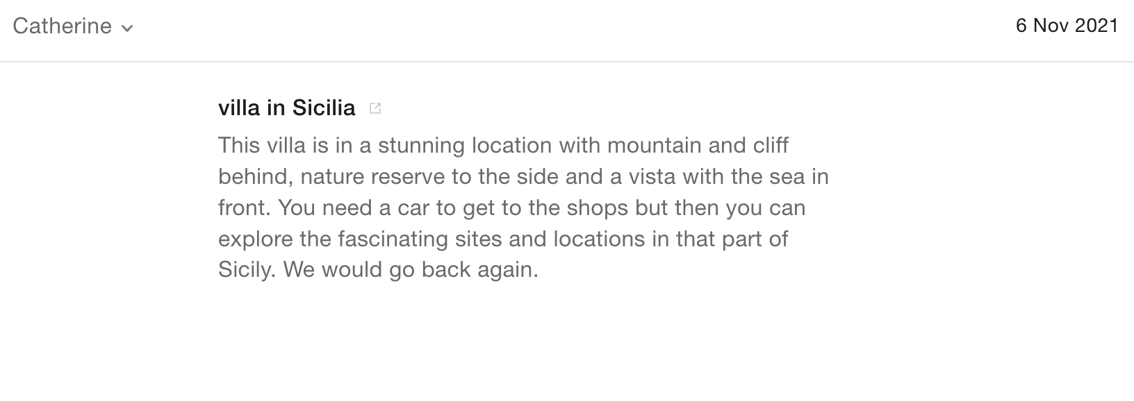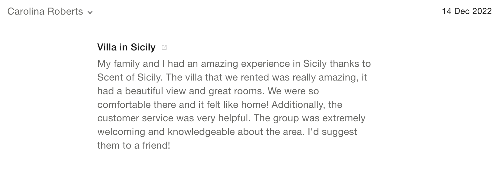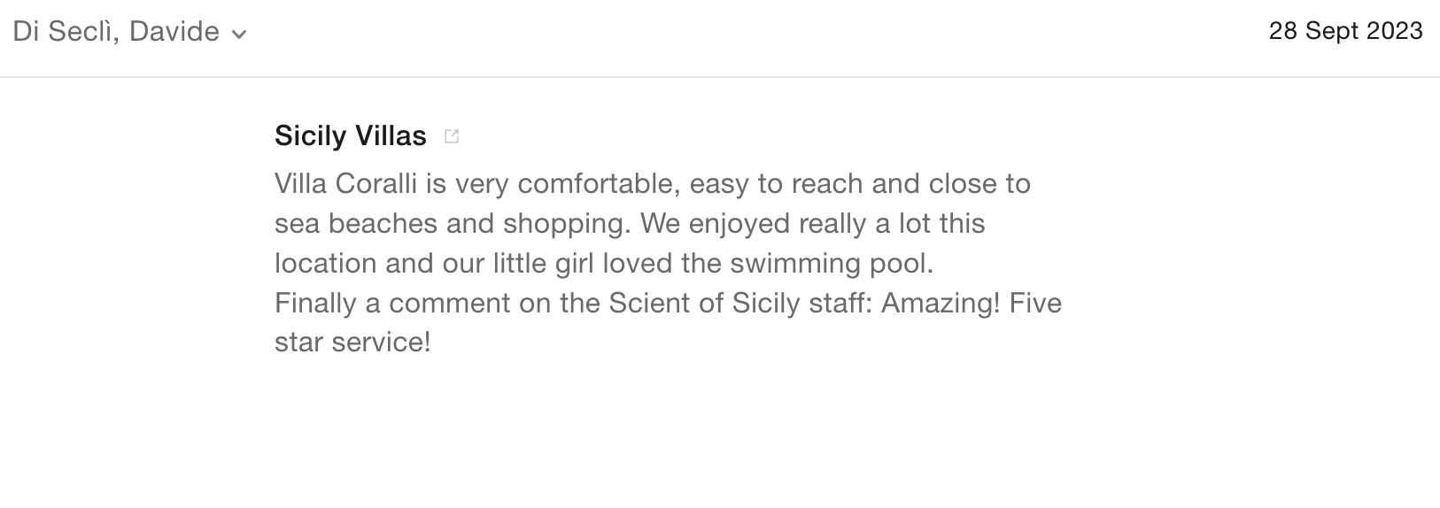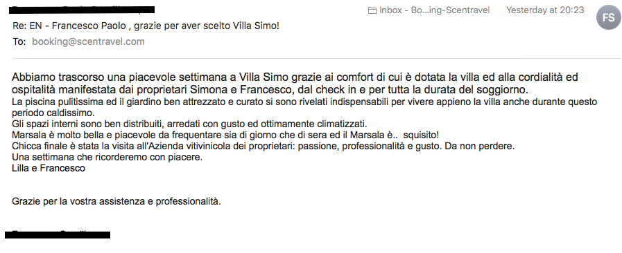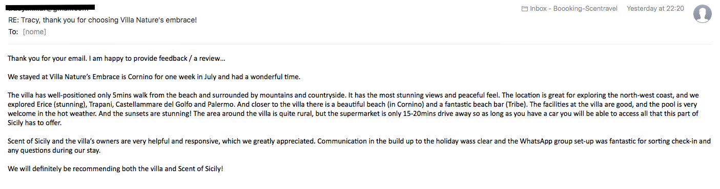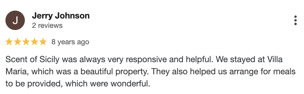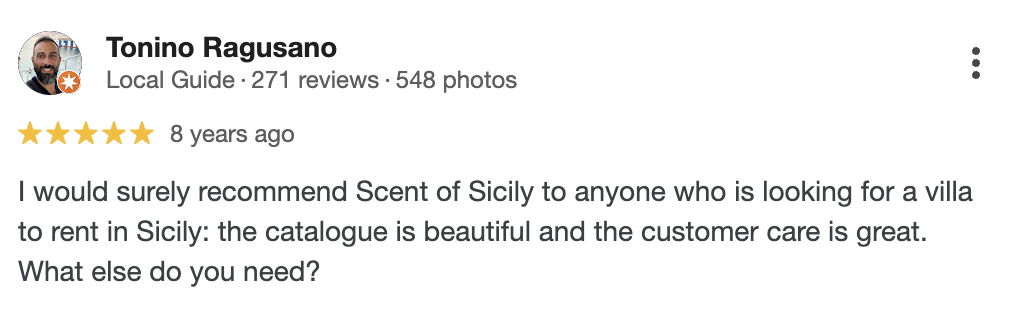 I would definitely recommend Scent of Sicily to anyone looking to rent a villa in Sicily: the catalogue is beautiful and the customer care is excellent. What more could you ask for.