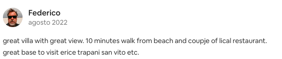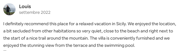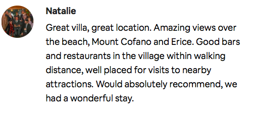 Great villa in a stunning location! The views over the beach, Mount Cofano, and Erice are truly breathtaking. The village nearby has good bars and restaurants, all within walking distance, making it convenient without sacrificing tranquility. It’s also a perfect base to explore nearby attractions. We had a wonderful stay and would absolutely recommend this place!