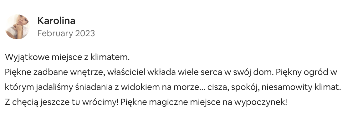 Pięknie utrzymane wnętrza, właściciel wkłada w swój dom dużo serca. Piękny ogród, w którym jedliśmy śniadania z widokiem na morze… cisza, spokój i niesamowity klimat.
