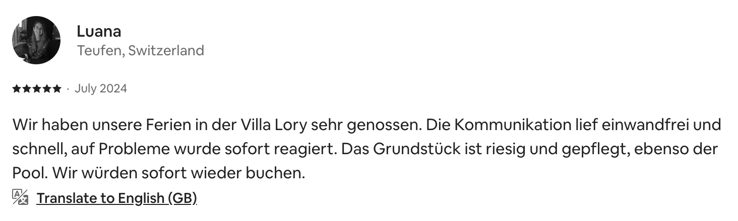 Wir haben unseren Urlaub in der Villa Lory sehr genossen. Die Kommunikation verlief reibungslos und zügig, und auf kleinere Probleme wurde sofort reagiert. Das Grundstück ist riesig und sehr gepflegt – ebenso wie der Pool. Wir würden jederzeit wieder buchen!