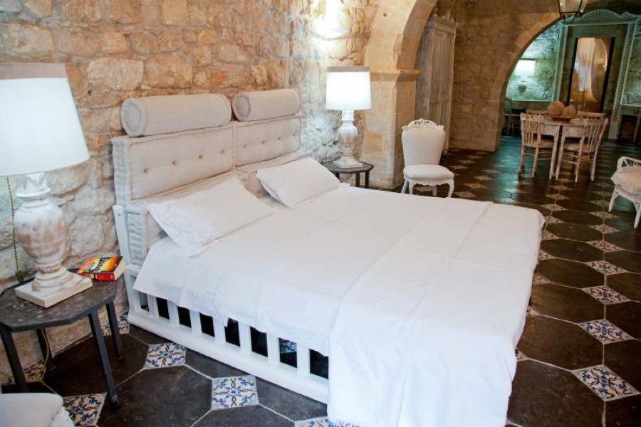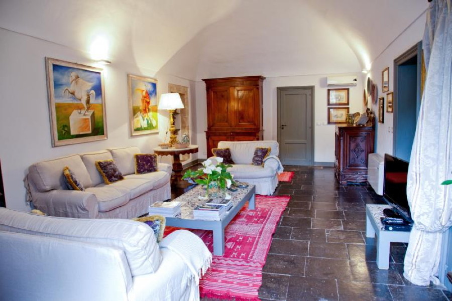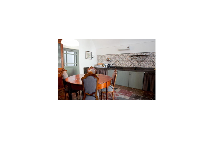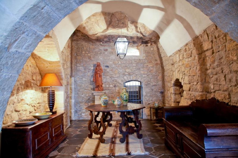 On the ground floor elegant furnishings stand out among the ancient tuff walls preserved despite the skillful restoration, recreating an environment similar to an Arab dammuso.
