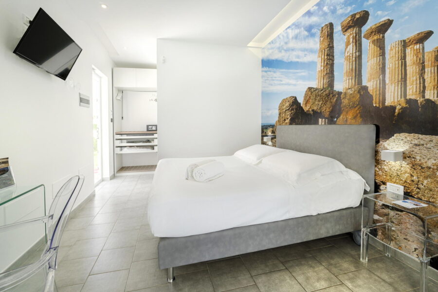 Gods Abode Room with Pool is your lavish refuge right in the heart of Sicily. Tucked down on a calm hillside, these rooms have a private plunge pool (1.8 x 4.5 metres) on the balcony (heated on request). From your own little retreat, savour breathtaking views of the Doric Temple of Juno, a UNESCO World Heritage site, and the magnificent Mediterranean Sea. Inside, you will find a friendly environment combining classic beauty with modern comfort.