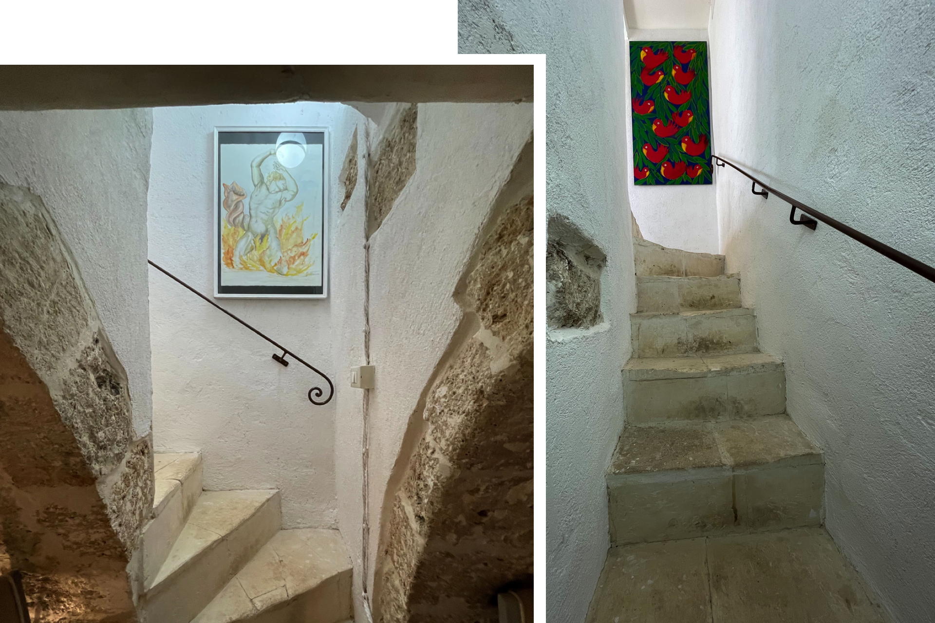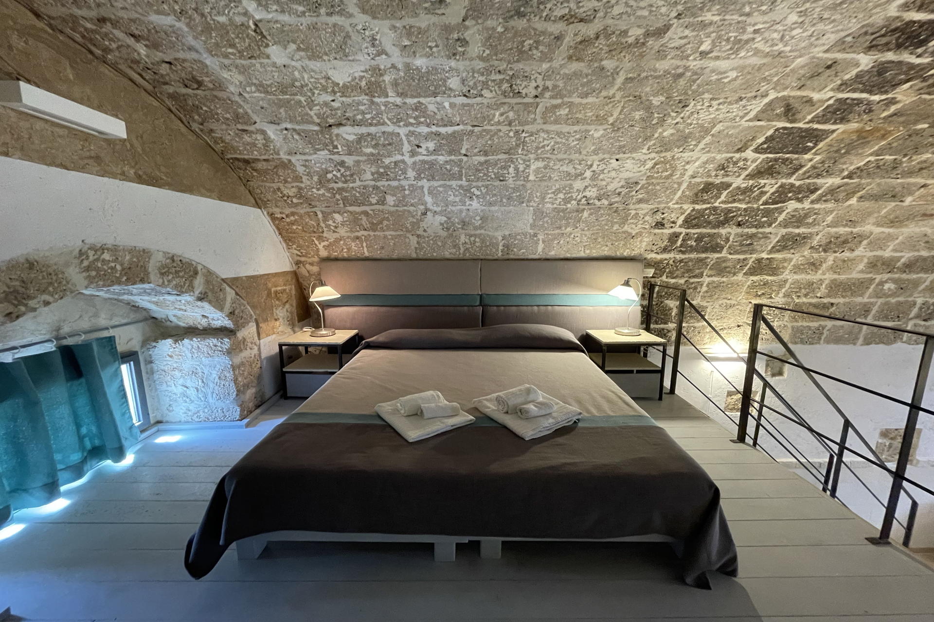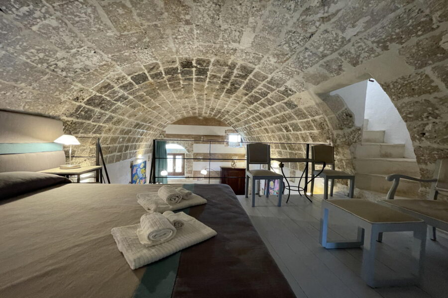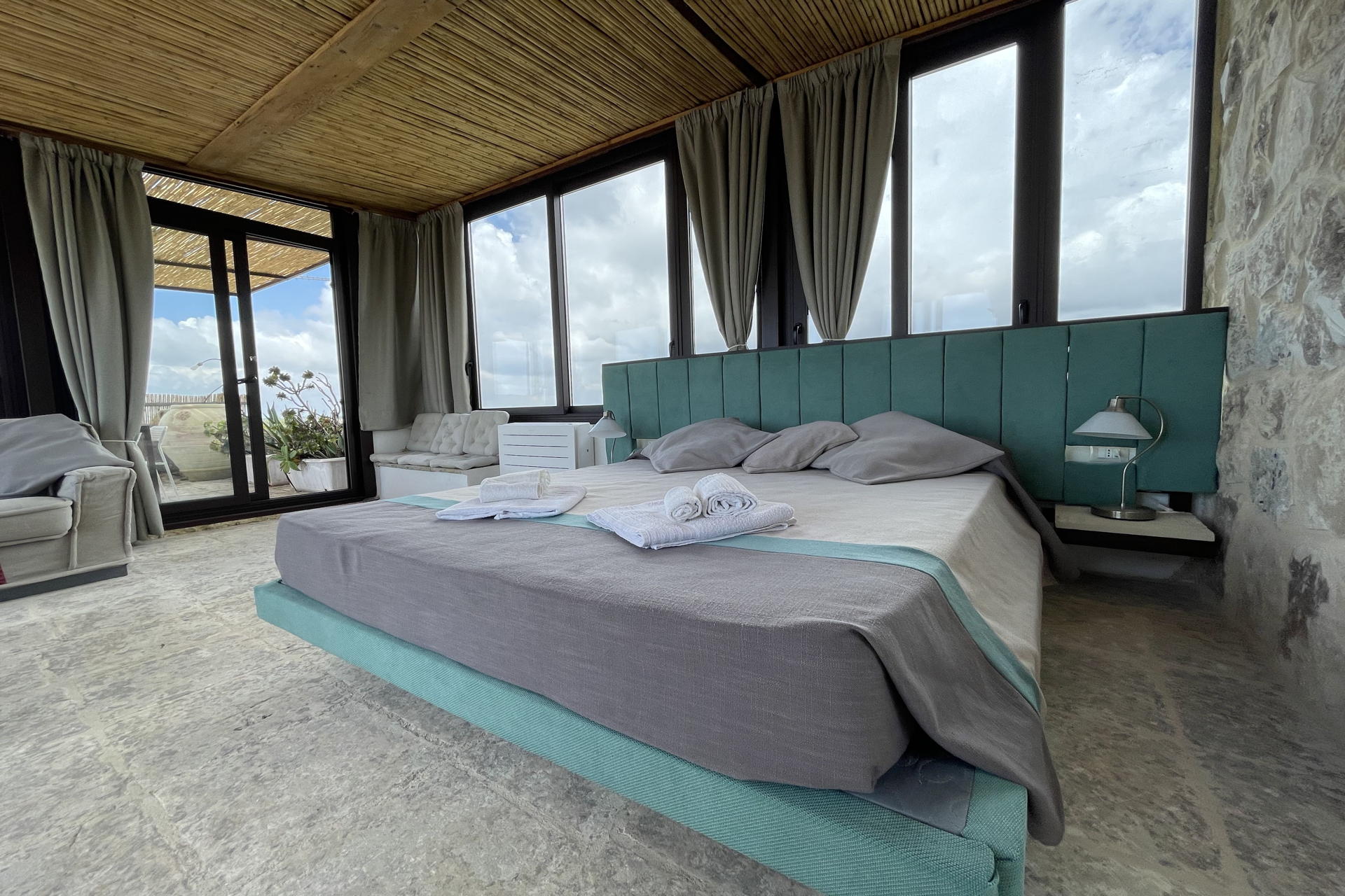Up an internal stone staircase to reach the terrace and the large bedroom- 1 Spacious double bedroom A/C en suite with shower with sofas whose large windows overlook the terrace.
