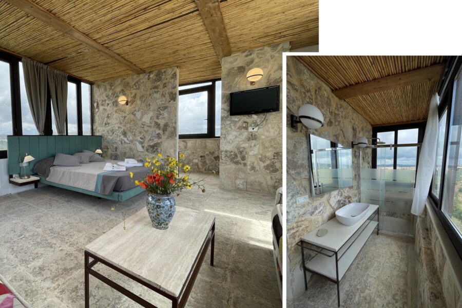 A cozy living area and a fully equipped kitchen invite guests to enjoy the comforts of home while being immersed in Sicily’s natural beauty. Every detail in the villa reflects a connection to the land, with vibrant fabrics, handcrafted touches, and large windows that frame the views outside.