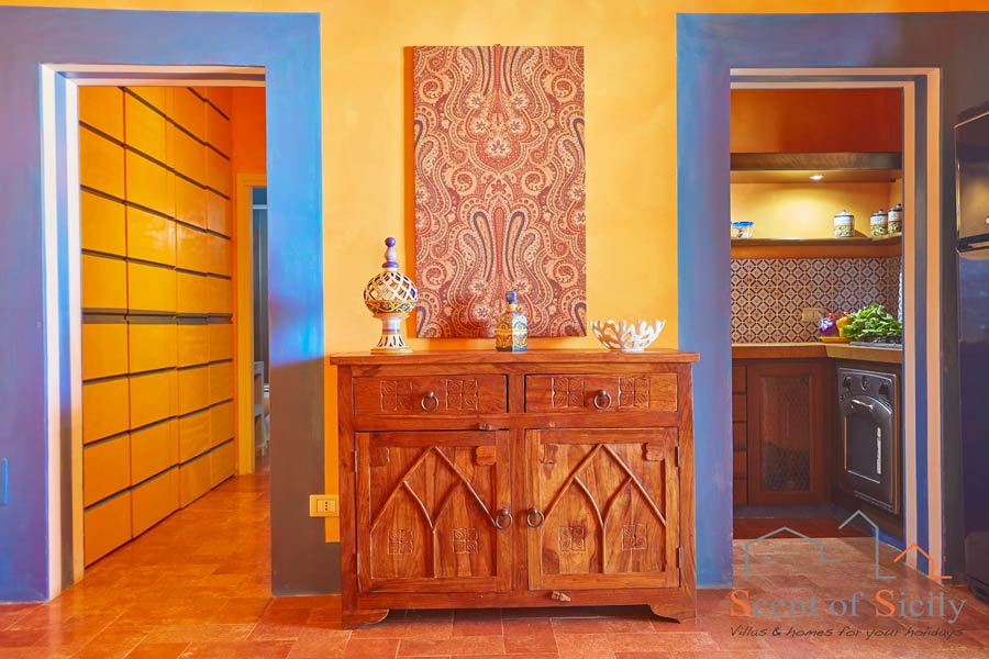 Once you get inside you will immediately notice the bright colours of the house. The shades of blue and yellow of the walls match perfectly the simple architecture resembling the typical Arab style.