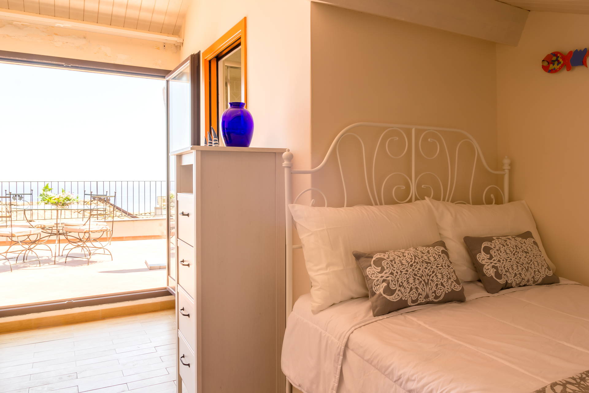 On a raised level, accessed by stairs, is a small attic room with a French bed and a veranda overlooking the sea.