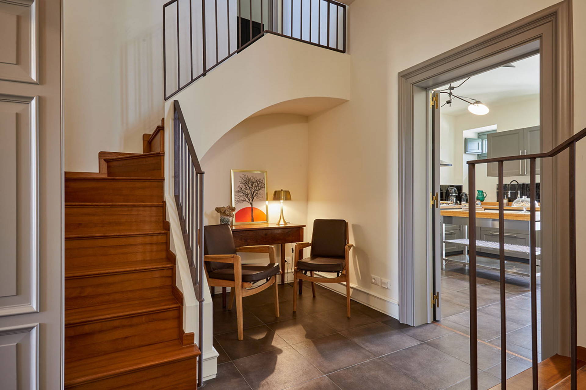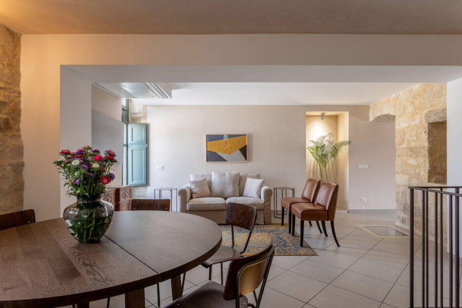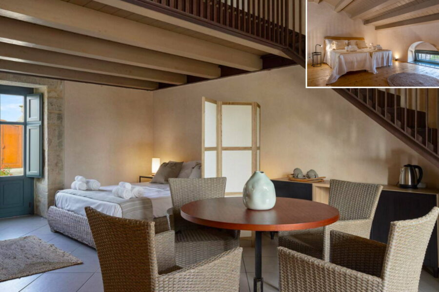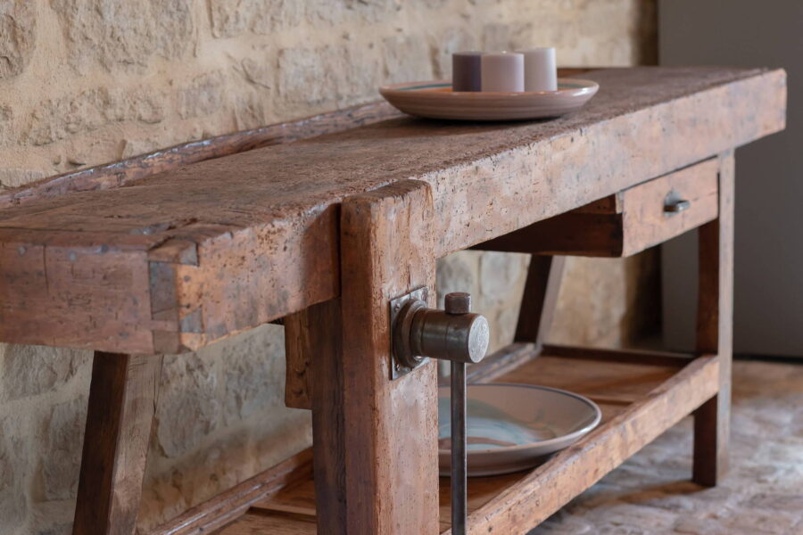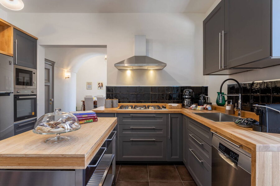 The building adjacent to the main villa comprises three spacious annexes, each with a double bed, en-suite bathroom and, in two of the rooms, a stylish mezzanine area with a single bed. The third building, the former stables, has been refurbished with meticulous care. The stone walls and striking beamed wooden roof have been retained and the whole area converted to provide an open-plan kitchen and dining area with a huge table that’s perfect for sharing special moments with friends and family.