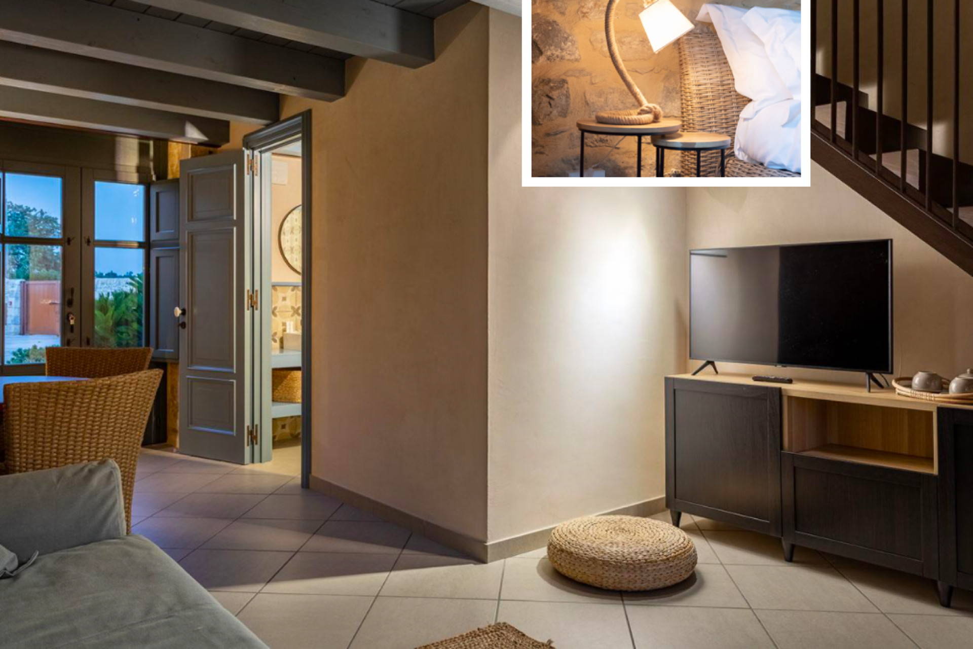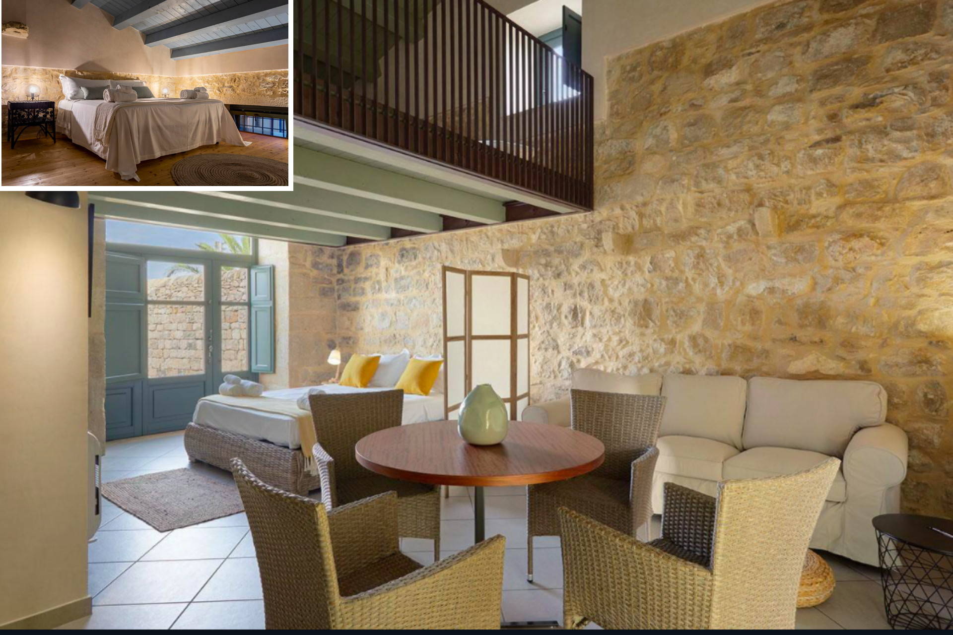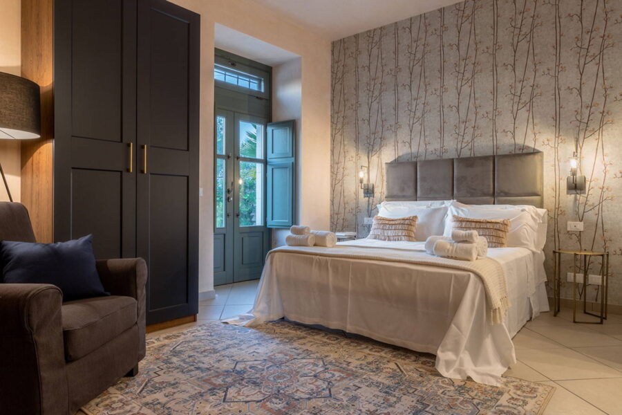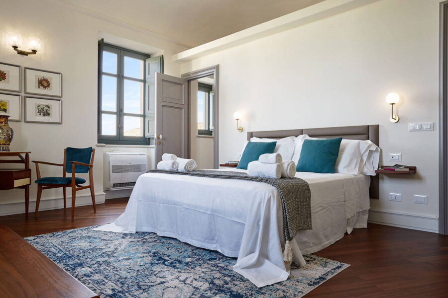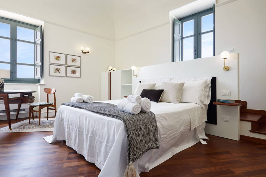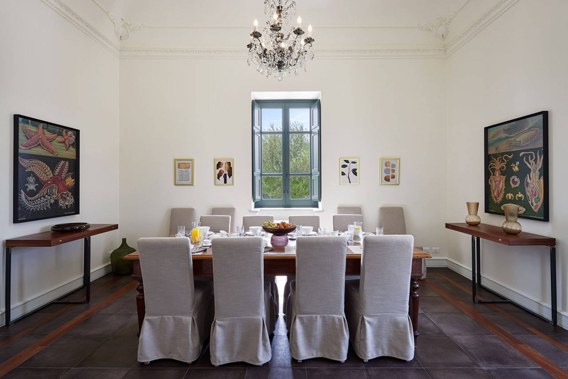 Villa Aida is made up of three separate buildings. The main villa is set on two floors: the ground floor has a bright and tastefully furnished living room, a modern, spacious kitchen with all mod cons, a dining room with a magnificent wooden table, and a guest bathroom. On the first floor, which can be accessed via two separate staircases, there are five double bedrooms (one with an additional double bed), each with their own private bathroom. This floor also has a comfy second living room, with a charming mini wine cellar that’s geared up for sampling the fantastic local wine. The villa’s luxurious interior is furnished with originality and charm, revealing a wonderful blend of contemporary design, vintage style and Sicilian flair.