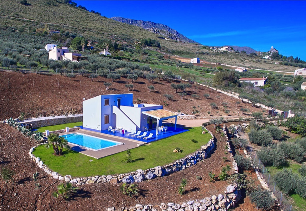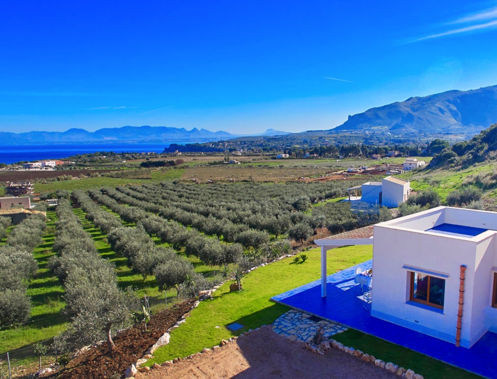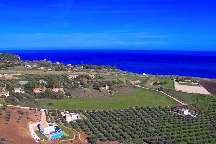 Built on a hillside, this villa has breathtaking views over the green olive trees that front the property and the blue expanse of the sea.
