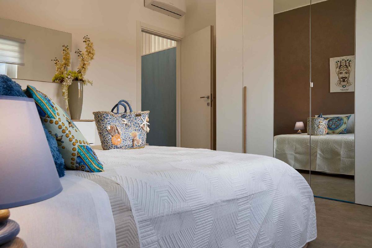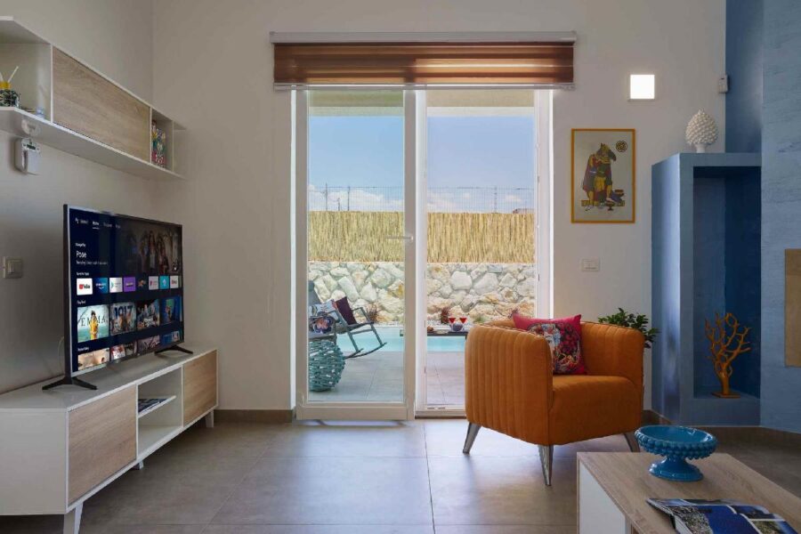 Just moments from the golden sands, Villa Azure Air is a sophisticated and inviting escape on the beautiful Sicilian coastline. This refined villa welcomes you with its harmonious play of colours, where the vibrant blue of the living room seamlessly reflects the shimmering blue of the heated pool just outside.