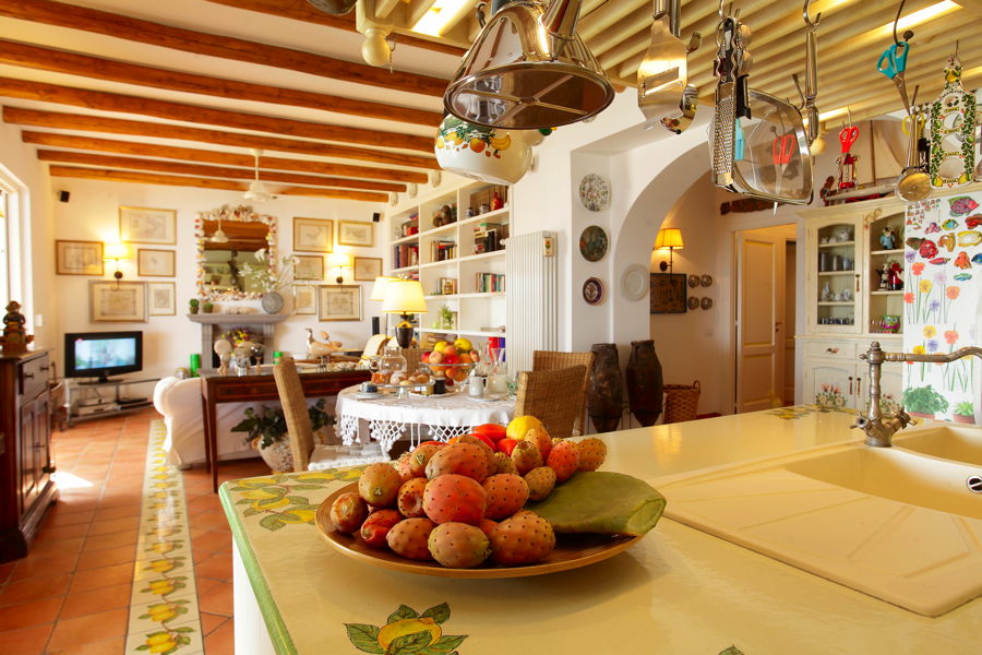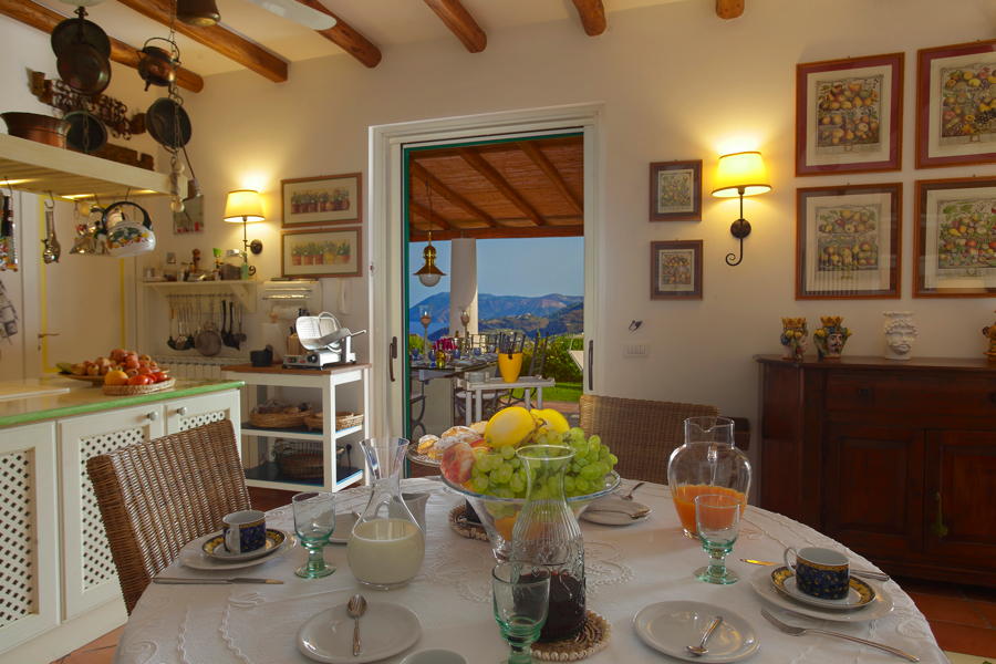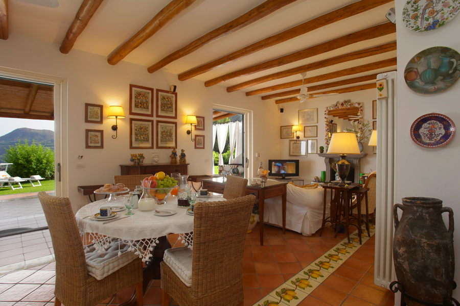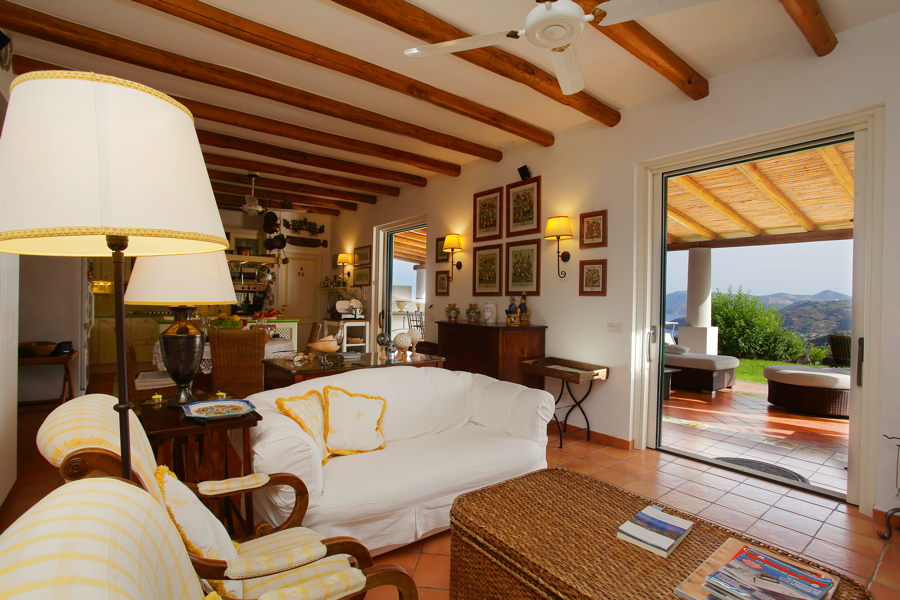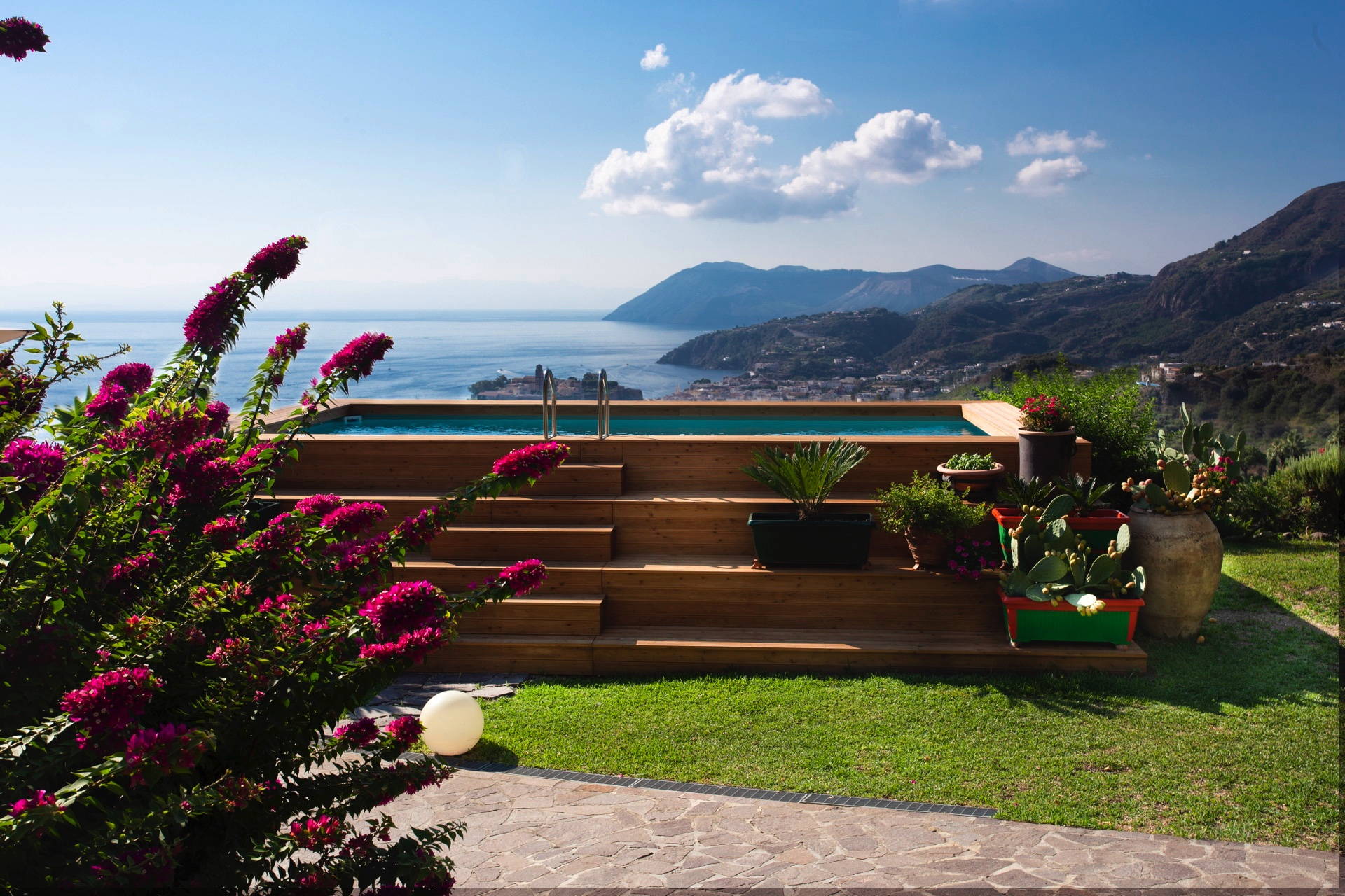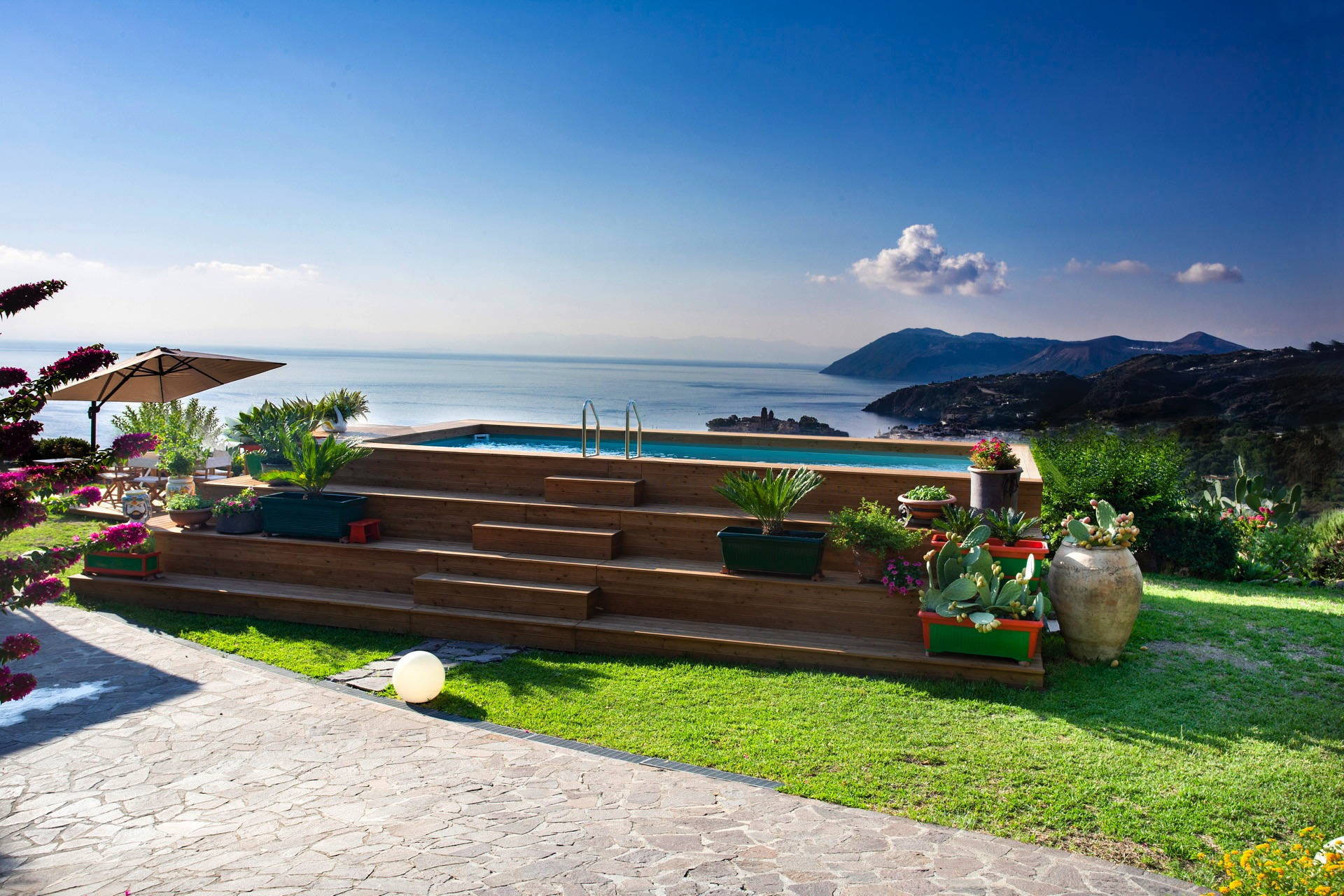 A charming atmosphere of total peace and relaxation, surrounded by the silence and the scent of the trees in bloom. The Villa is surrounded by a large garden with private pool, lush plants and flowers, and leans on a panoramic terrace typical Aeolian; a very lightful living room and well equipped kitchen; 3 bedrooms all with view on the garden the pool and on the blue sea.