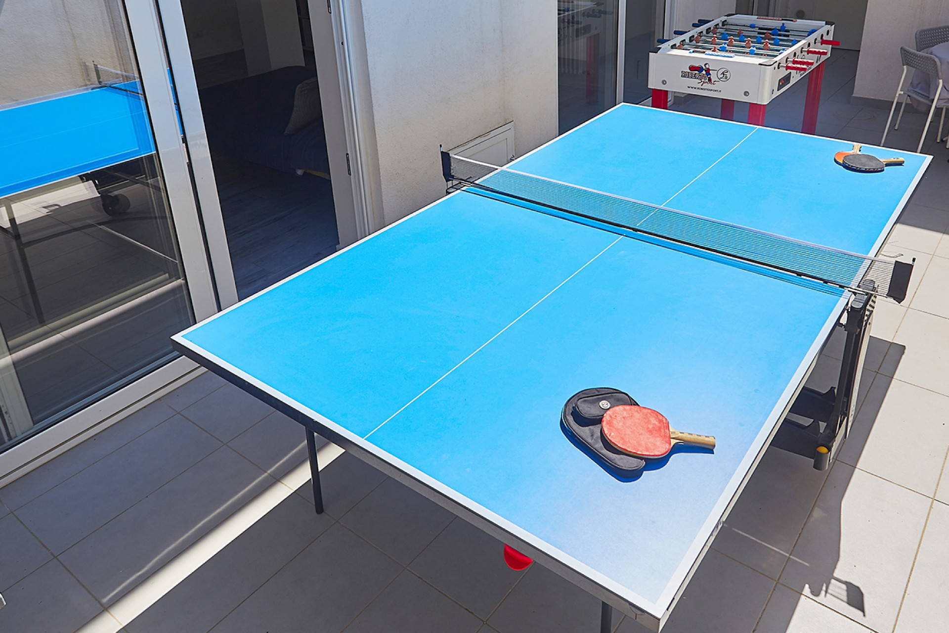 - small terrace in one area of teh garden where there is a table tennis table and the five-a-side football table.