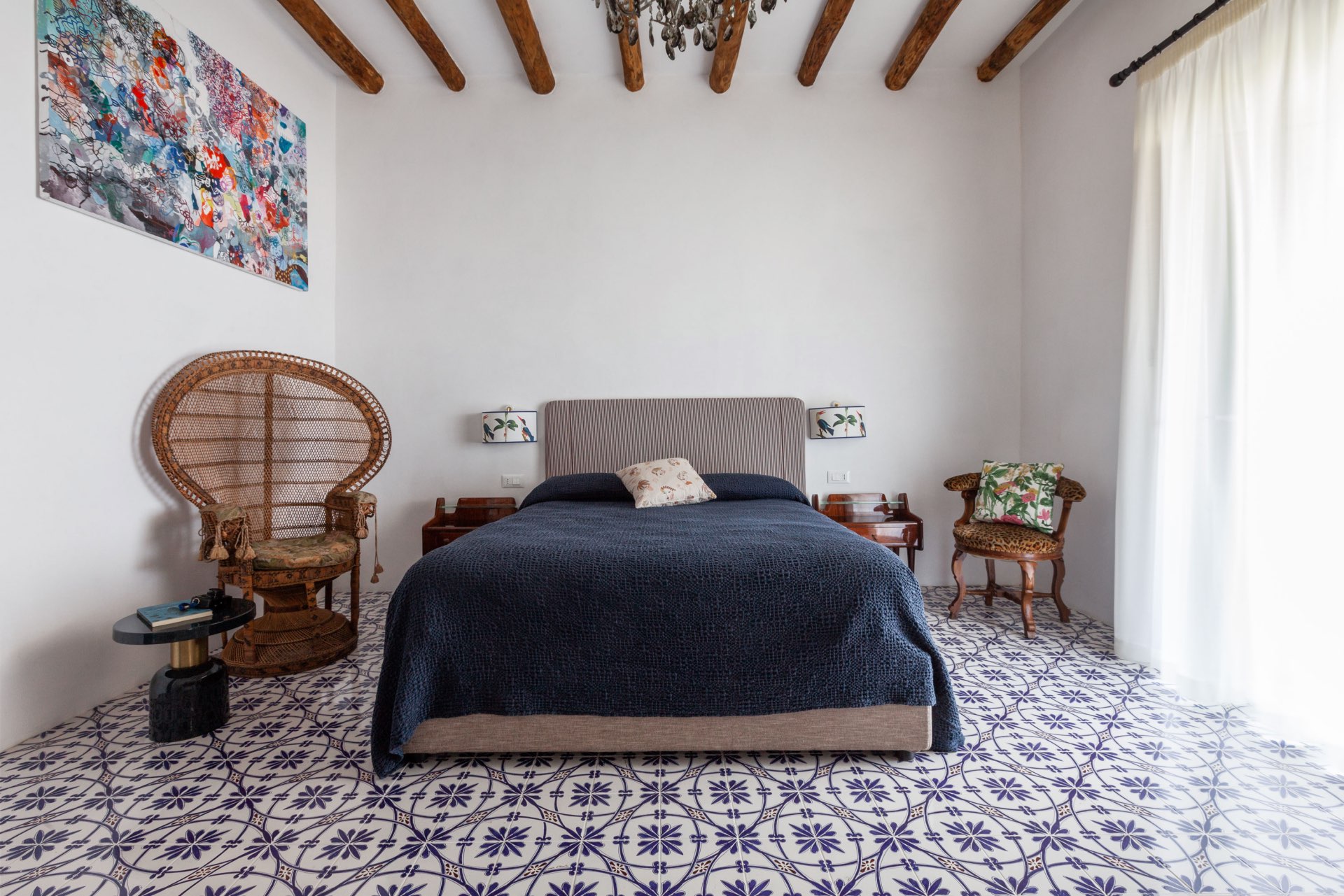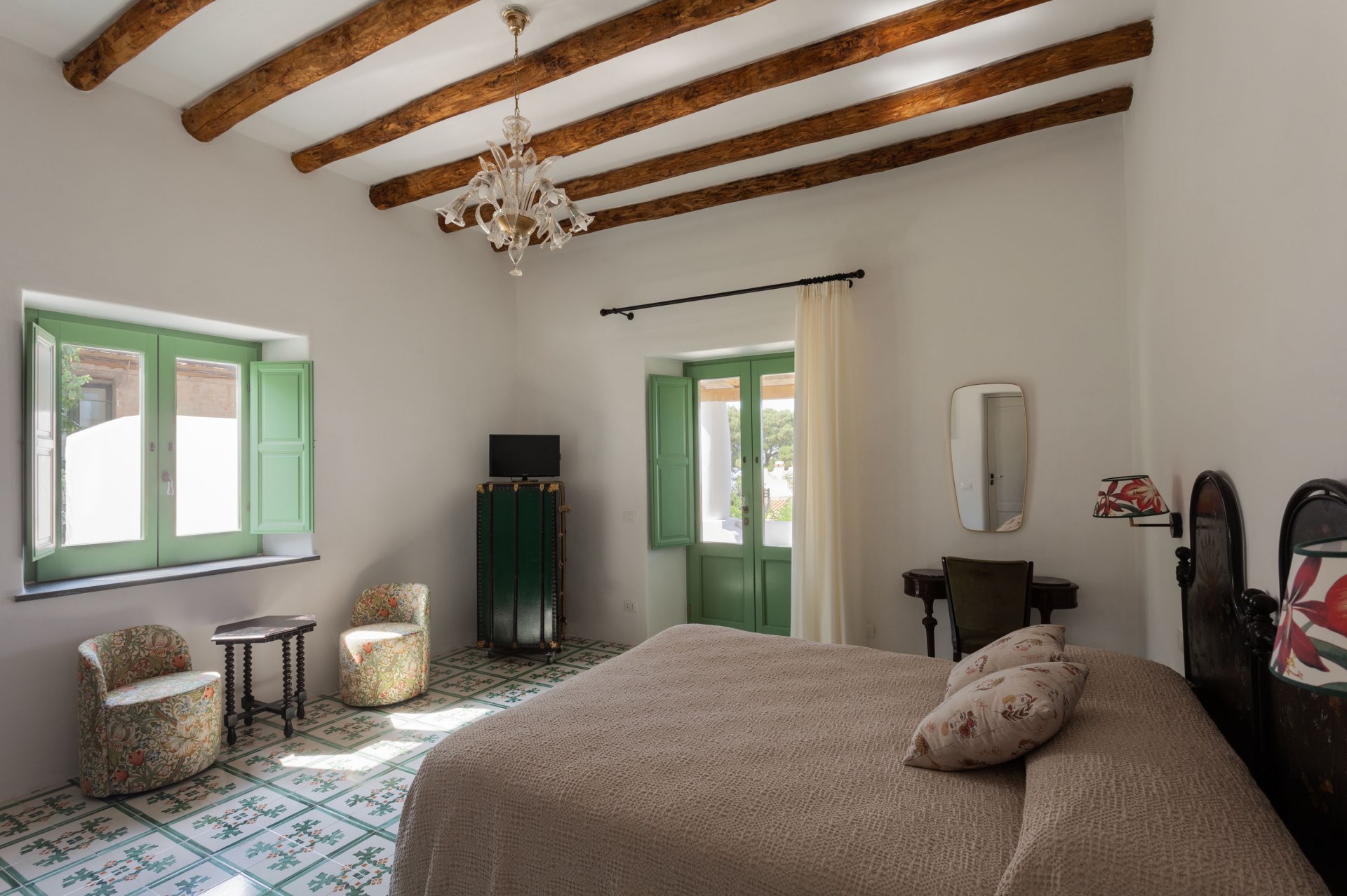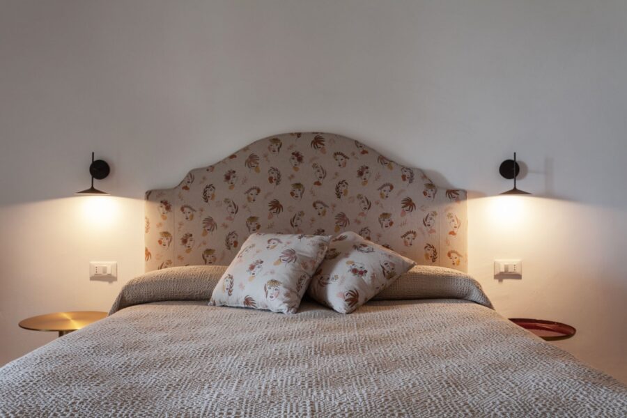 Inside, Villa Eolo has cozy, well-chosen furniture. The beautiful ceramics of Santo Stefano di Camastra, which adorn every room in the villa, flow through it like a vibrant thread. Clio’s golden wallpaper exudes nobility, Urania reflects the beauty of the sky, Talia’s unique qualities make you smile, and Calliope’s antique charm lends an air of old-world elegance. The living room’s black-and-white checkered floor and wooden accessories give it a cozy yet stylish vibe.