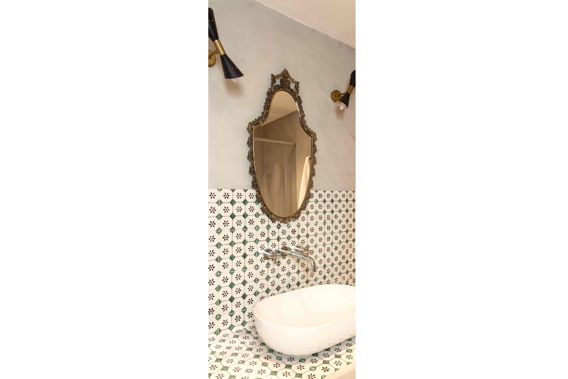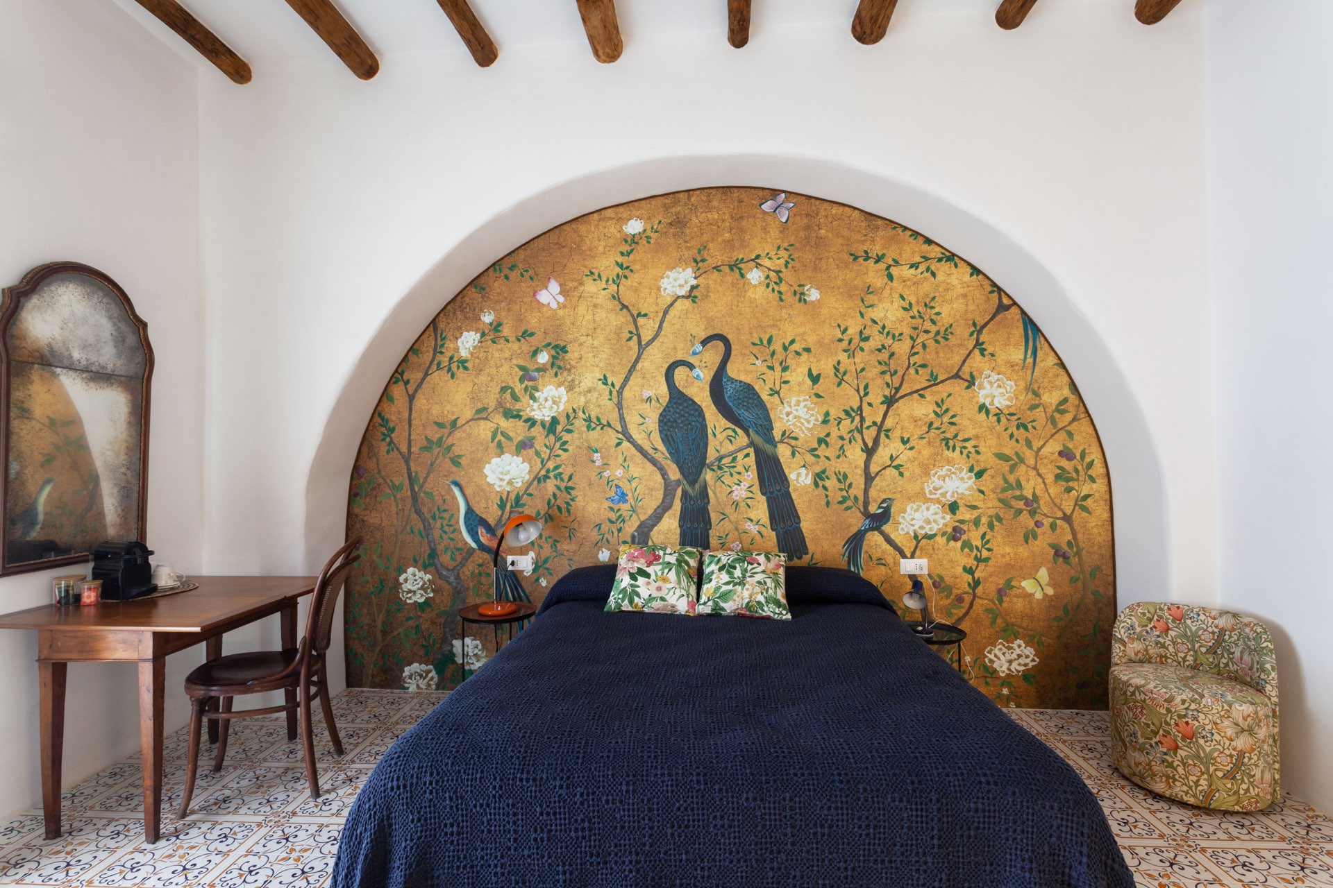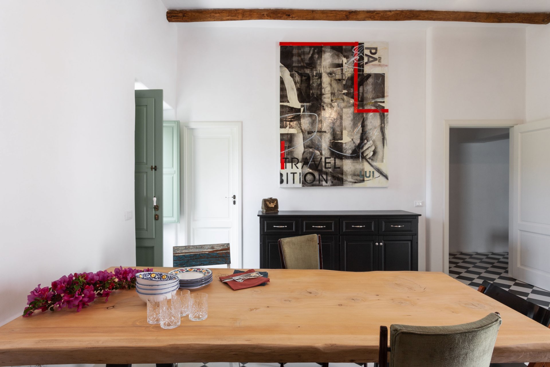 Inside, Villa Eolo has cozy, well-chosen furniture. The beautiful ceramics of Santo Stefano di Camastra, which adorn every room in the villa, flow through it like a vibrant thread. Clio’s golden wallpaper exudes nobility, Urania reflects the beauty of the sky, Talia’s unique qualities make you smile, and Calliope’s antique charm lends an air of old-world elegance. The living room’s black-and-white checkered floor and wooden accessories give it a cozy yet stylish vibe.