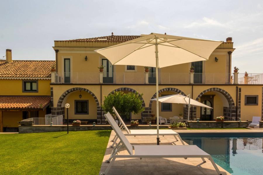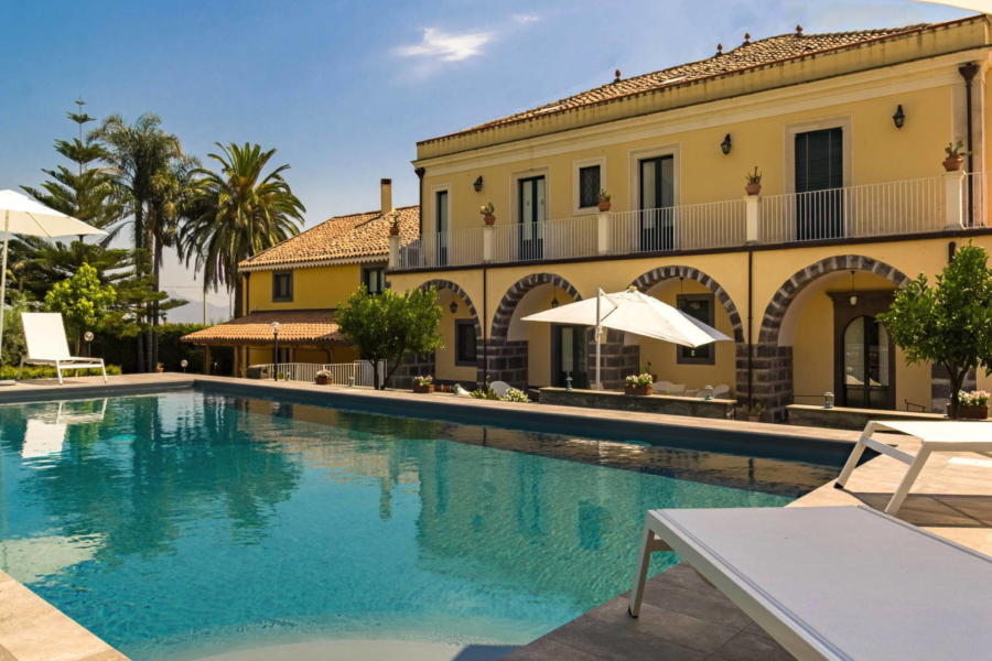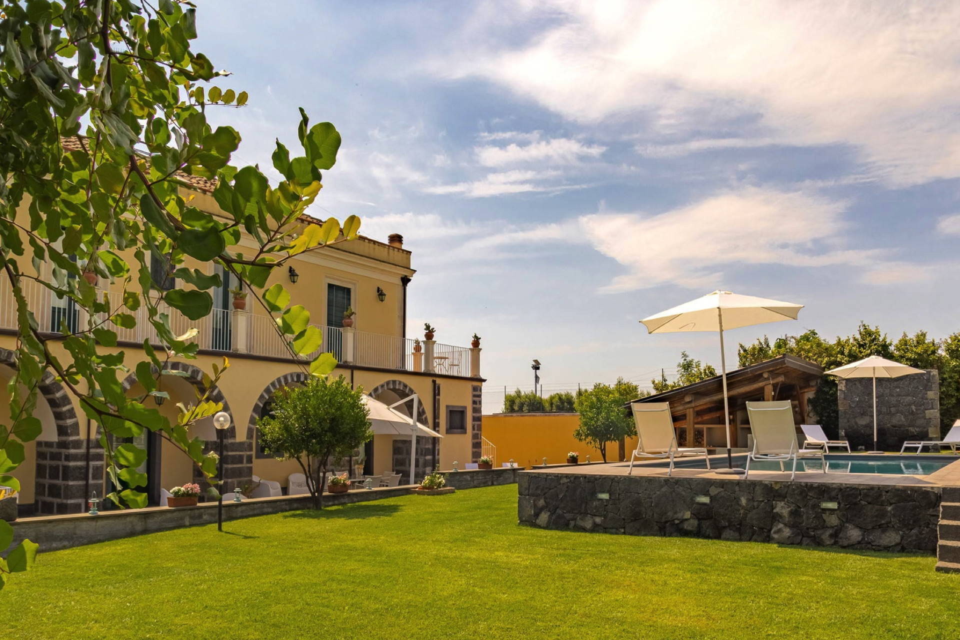 Echoes of 19th century Sicily are renewed in this charming manor house, restored to its former glory. On arrival, the immediate sensation is the spaciousness and elegance of the outdoor spaces: a well-kept garden, the typical citrus trees, the green lawn surrounding the marvellous swimming pool set like a gem between lava stone walls, the magnificent portico of the ancient building.