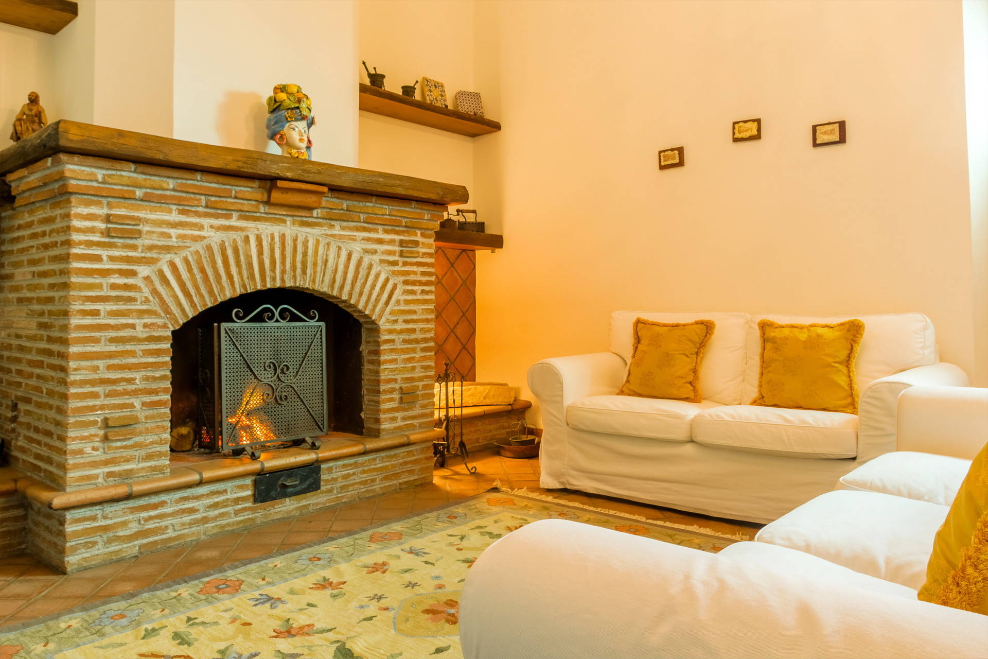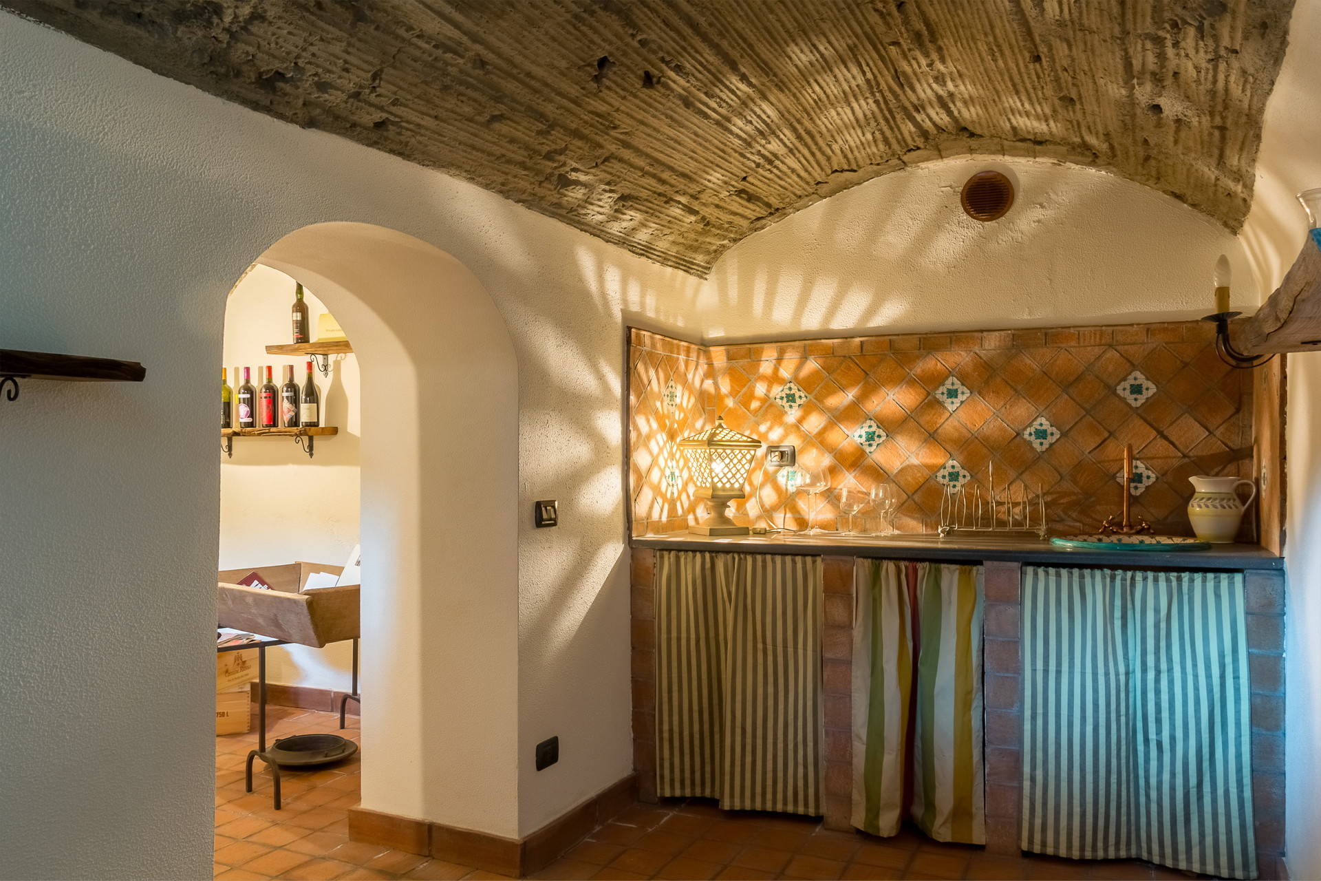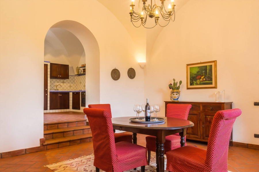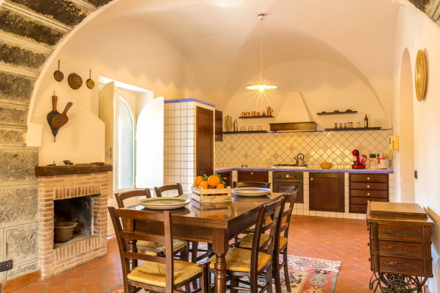 Enter, you are greeted by a hall of extraordinary beauty! It used to be an ancient palmento, today it is a very spacious room with a large fireplace, beautiful sofas and antique furniture, such as the perfectly restored dining table. The adjoining kitchen echoes the rural style, with traditional tools prominently displayed on the walls, but is equipped with modernity. There is also a service bathroom on the same floor.