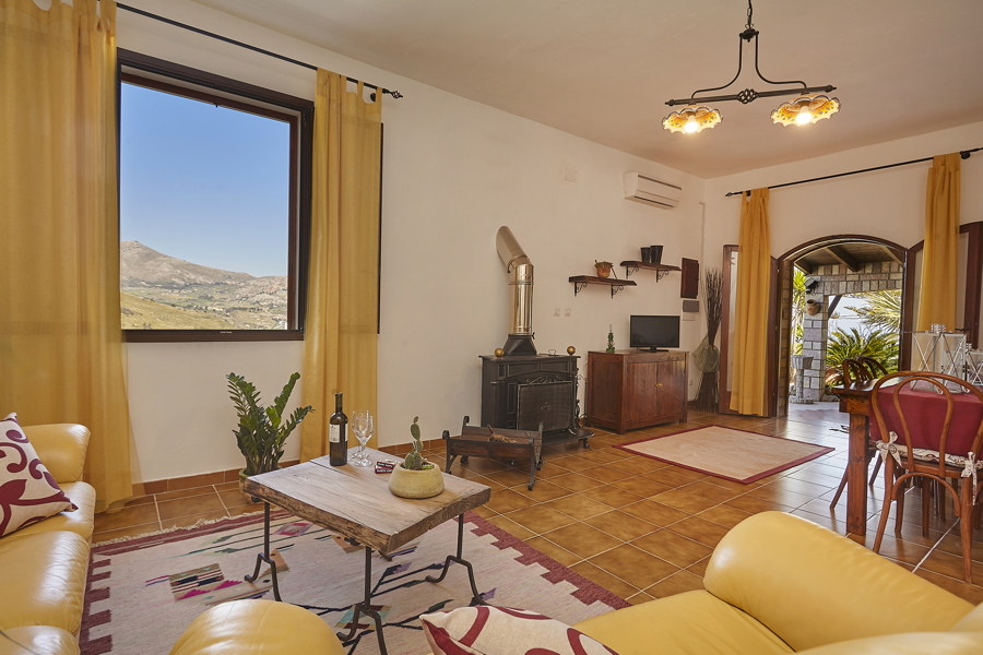 From the covered veranda, you access the living room area, tastefully furnished with comfortable couches, a fireplace, air conditioning and a dining table. Next to this room you will find a fully equipped kitchen. The kitchen also gives direct access to the veranda, which has a table and chairs.