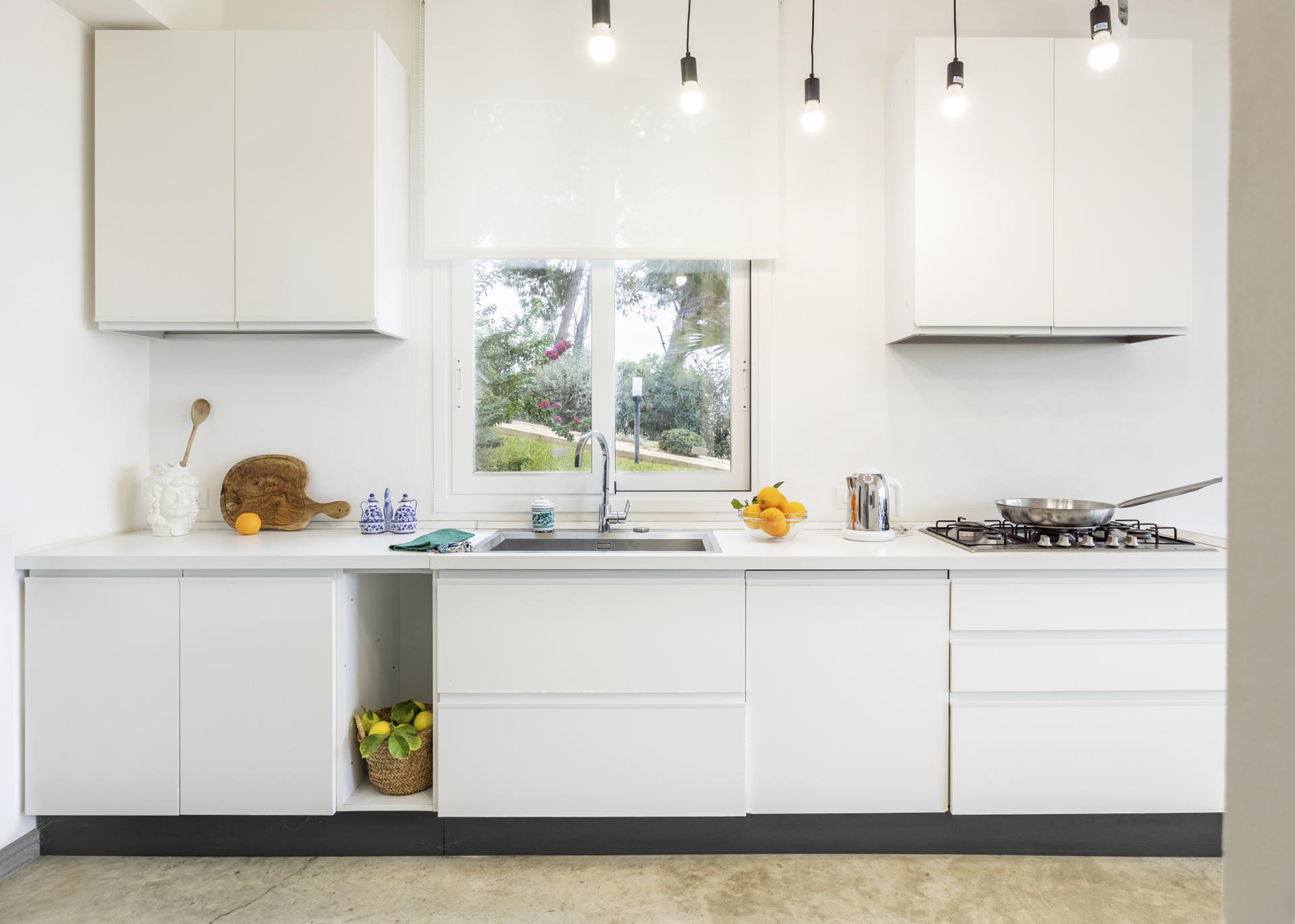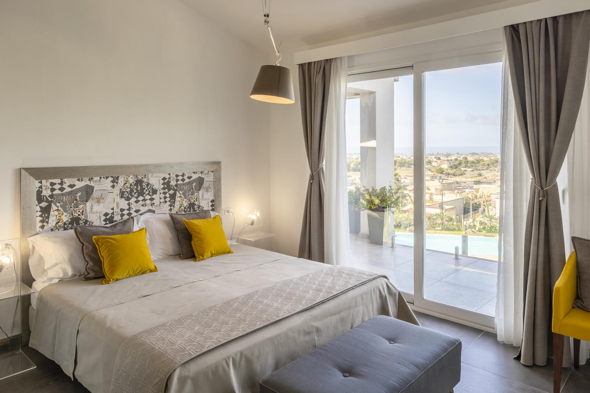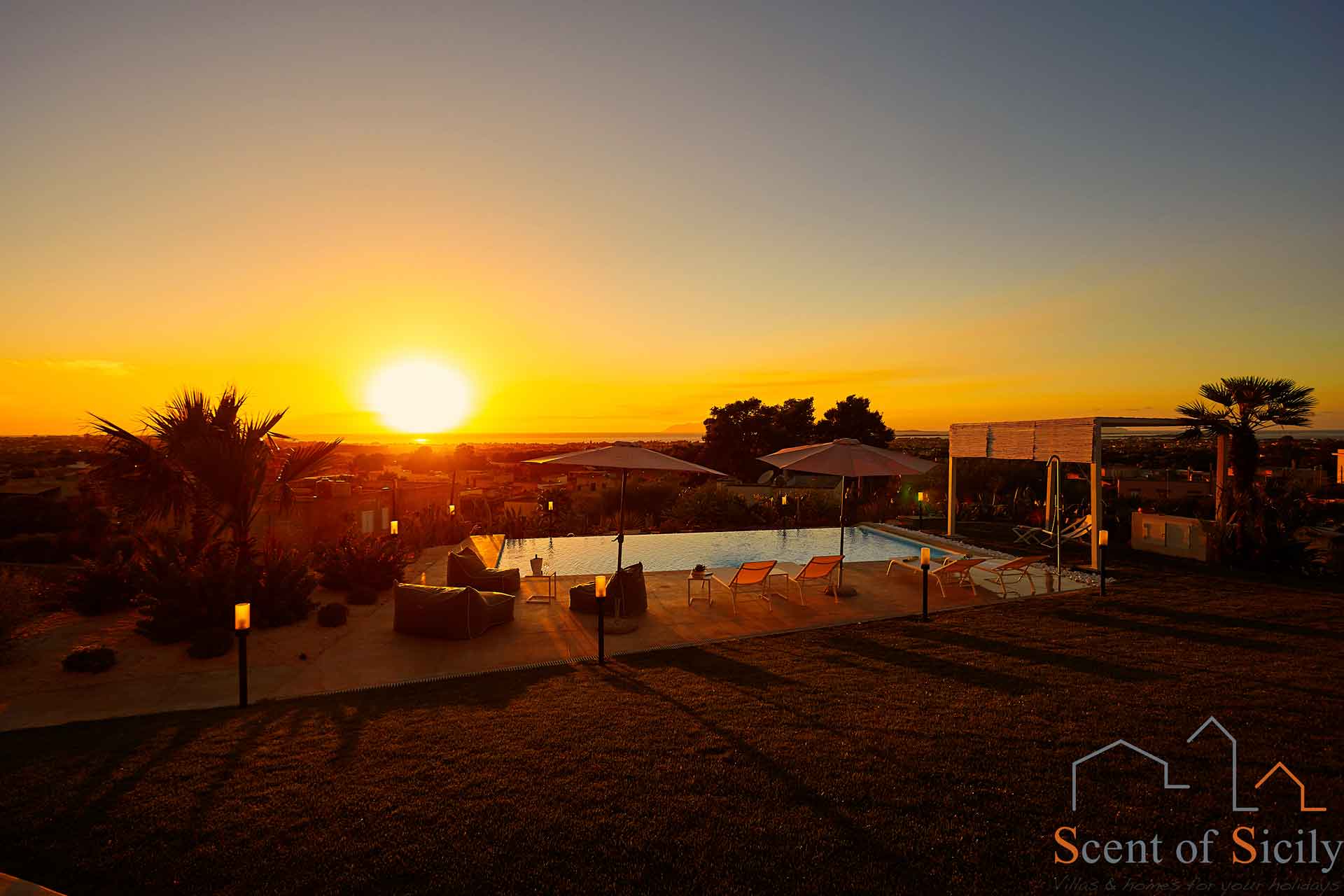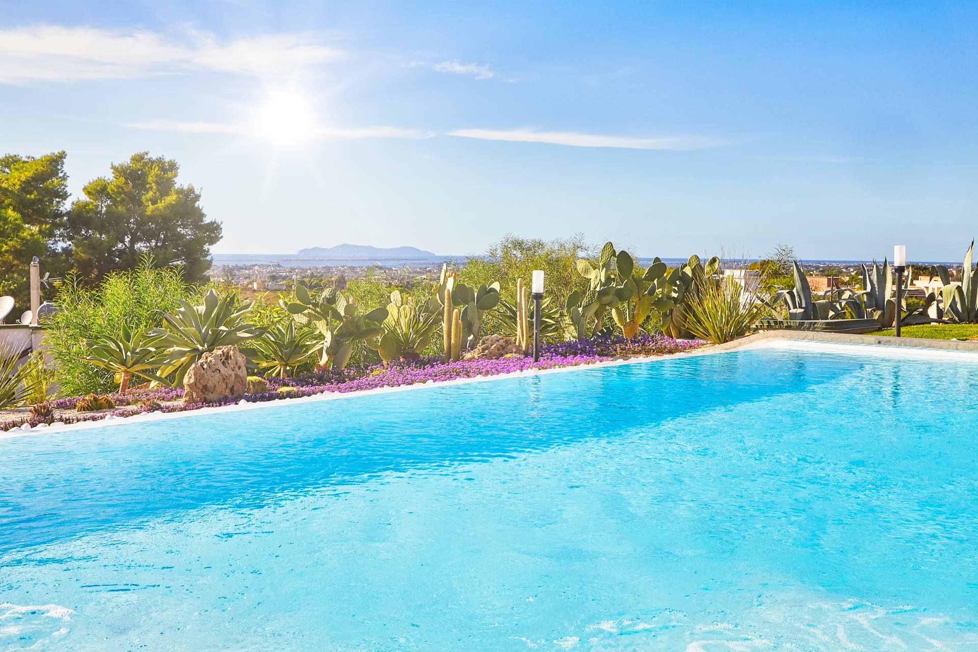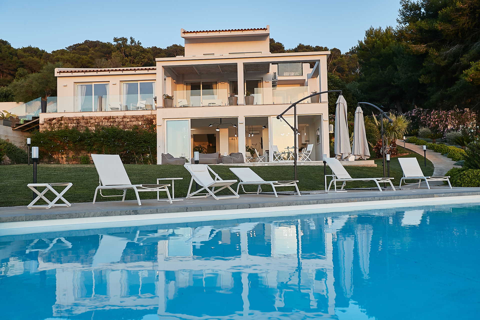 The pool features hydromassage (and comes equipped with auto-cleaning robot), and a solarium area furnished with sun loungers, bean-bag chairs and parasols. From the garden you can enjoy a striking panorama, especially at dusk, but the view from inside the house is no less enchanting, thanks to the large glass windows.
