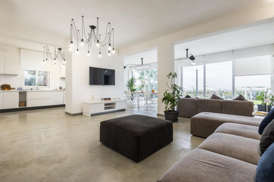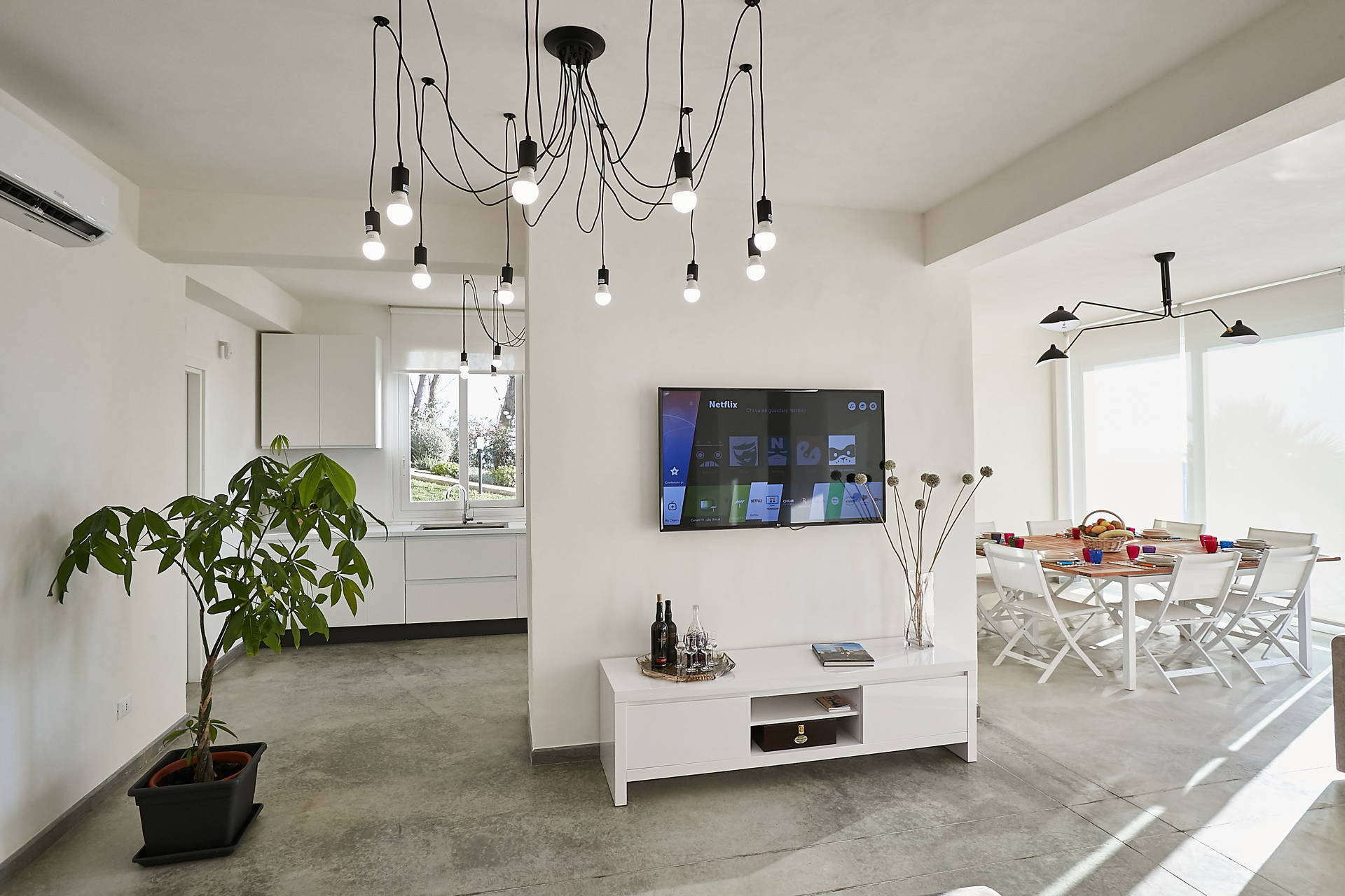 On the lower ground floor you will find the living area with flat TV/Netflix, featuring with a panoramic living room with dining area and the fully equipped kitchen. At the ground floor there are 4 bedrooms, all provided with bathrooms en suite, air conditioners and flat TV. Two of the bedrooms feature also single sofa-beds for extra guests.