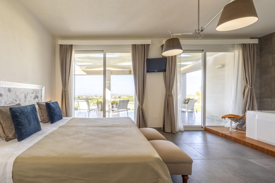 The interior design matches the elegance and minimalism of the architectural style, featuring a light decor and a high care for details. On the first floor you will find one of the bedrooms, a double with A/C and flat TV, plus a bathroom featuring hydromassage shower. From the room you will also access the panoramic terrace overlooking the garden and the coast.