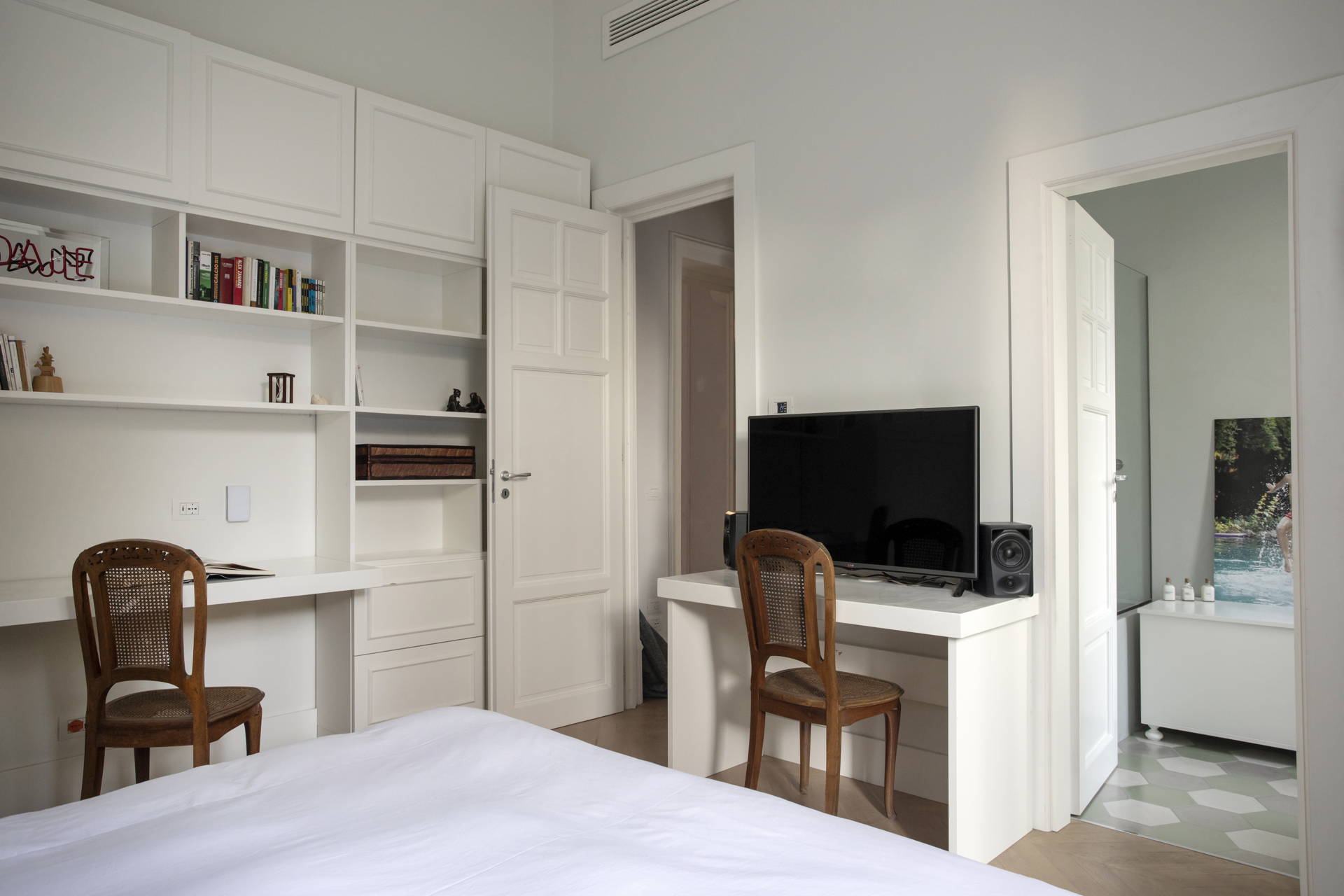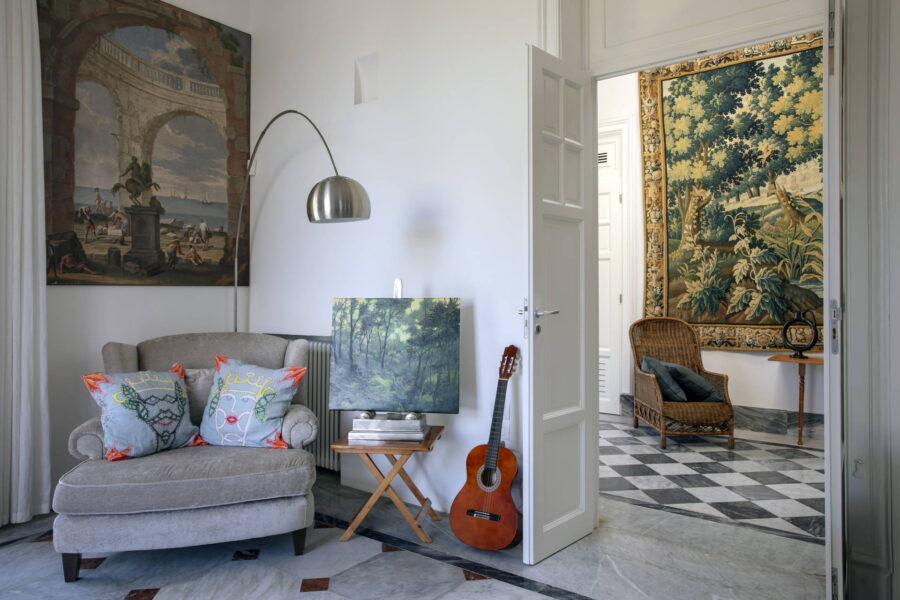 This historic villa has been meticulously restored, with Liberty architectural elements carefully preserved. Flourishing floral patterns, ceramic tiles, iron staircase railing, stuccoes, mouldings, and stained-glass windows enrich its charm.