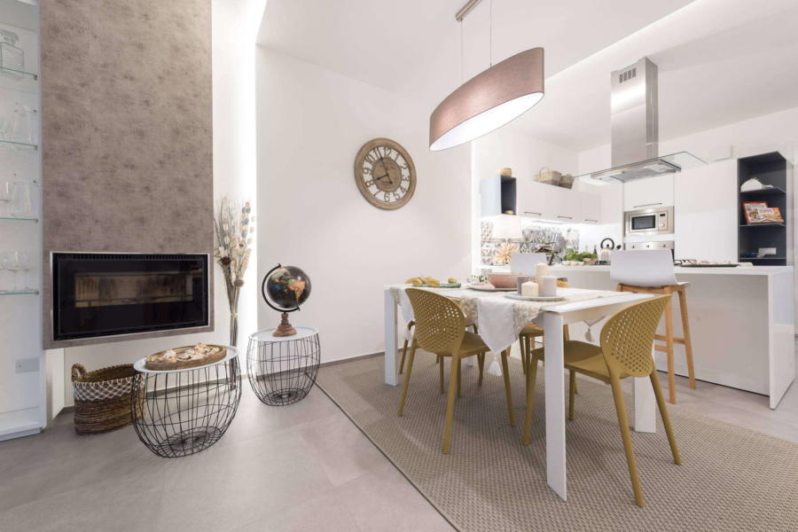 White shuttered doors lead into the living room and attractive majolica-tiled kitchen.