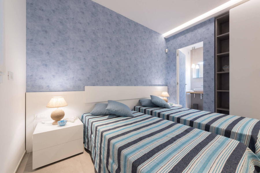 The sleeping area comprises two bedrooms decorated in warm, earthy colours and shades of green (double bedroom) and blue (twin bedroom).