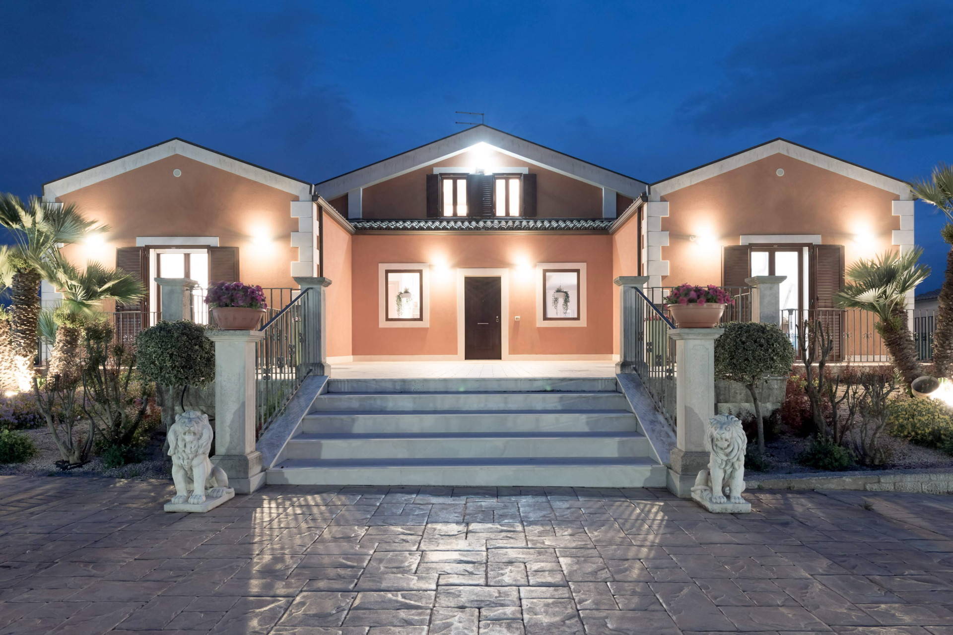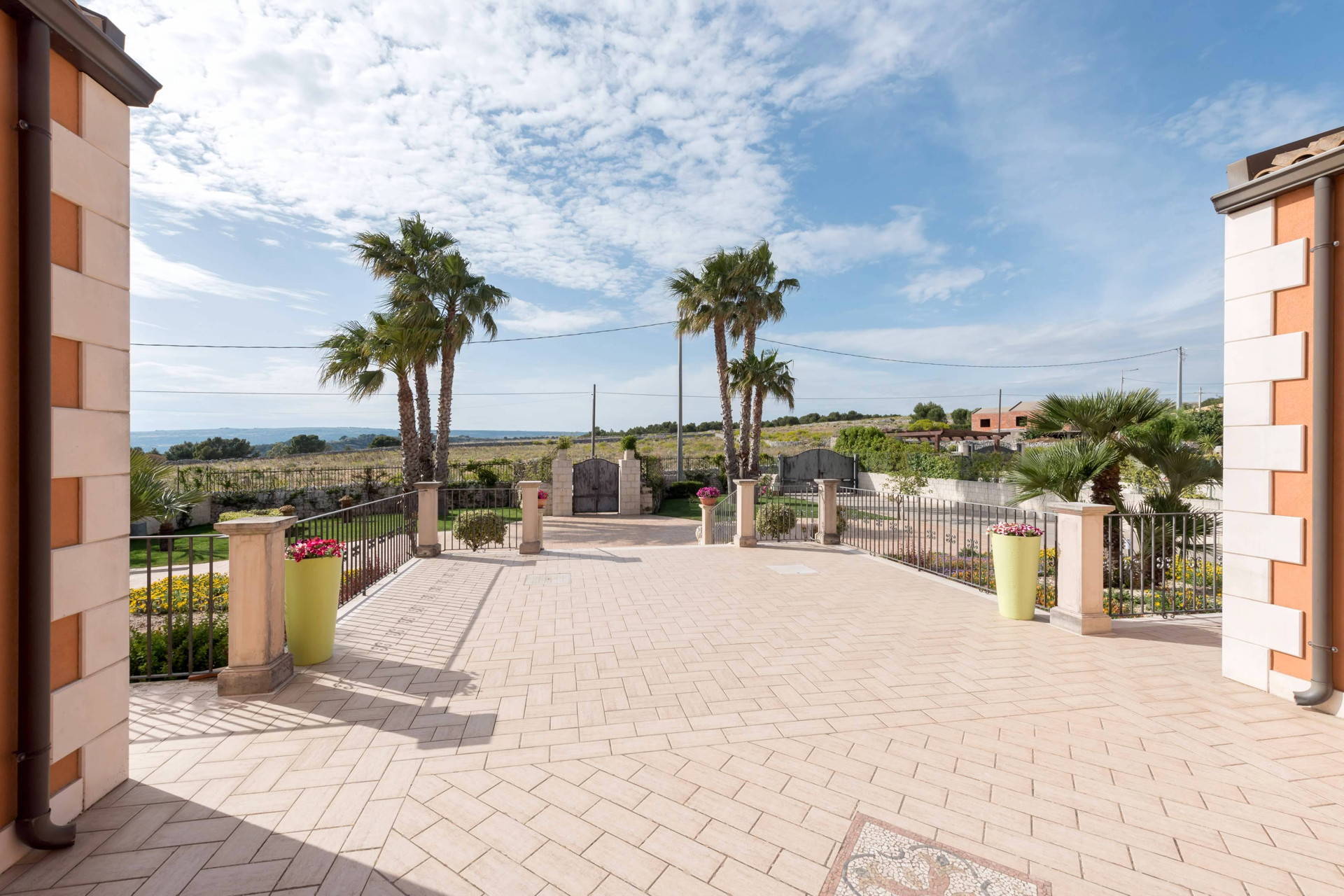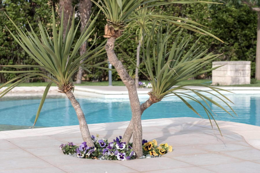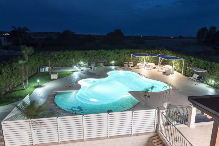 Stepping into the entrance of the property, you’ll find yourself in a large courtyard, bordered by flowerbeds and leafy borders, and the pool area. White stone steps lead into the pool, which has a small section suitable for children and has a stunning white Modica stone surround.