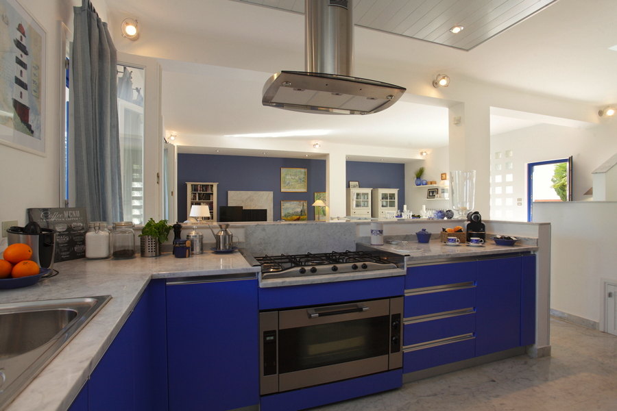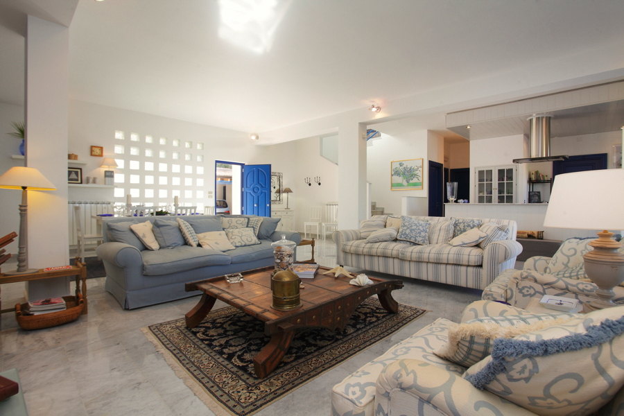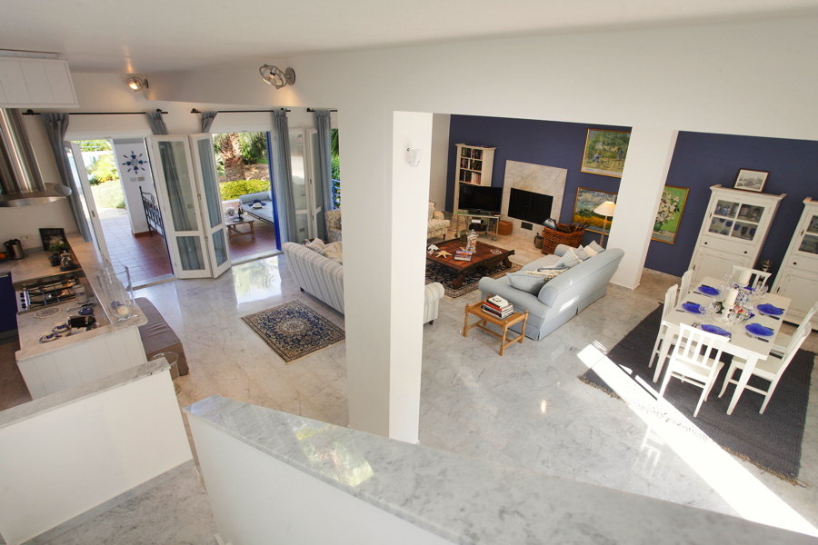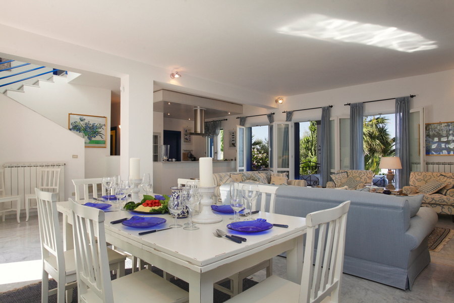 Inside the villa is really full of light; on the ground floor there are the living room with dining area, the perfect place for relaxing and for living convivial moments all together, and the well equipped kitchen.