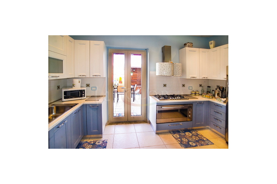 The kitchen on the first floor opens onto the first terrace, which is equipped with both a traditional barbecue grill and a gas one, a dining area and a play area for children.