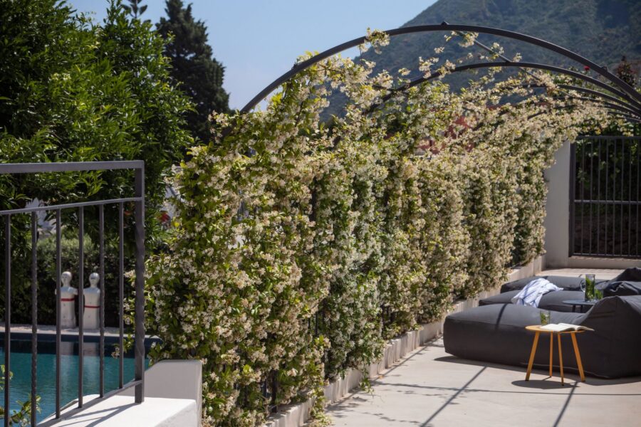 As you approach Salina Terrace Villa, the allure of its stunning outdoor spaces becomes immediately apparent. The expansive terrace, adorned with lush greenery and vibrant flowers, provides a perfect vantage point for sweeping sea views. Comfortable loungers and a shaded dining area invite you to relax and savour the Mediterranean breeze. Seamlessly blending with the horizon, the infinity pool offers a refreshing escape during warm Sicilian afternoons. The Aeolian porch is ideal for breakfast, with stunning views over rooftops to the sea. The garden, with citrus plants and fragrant flowers, frames the infinity pool with a pergola for alfresco dining. The courtyard offers ample parking space and an area for electric scooters available to guests.