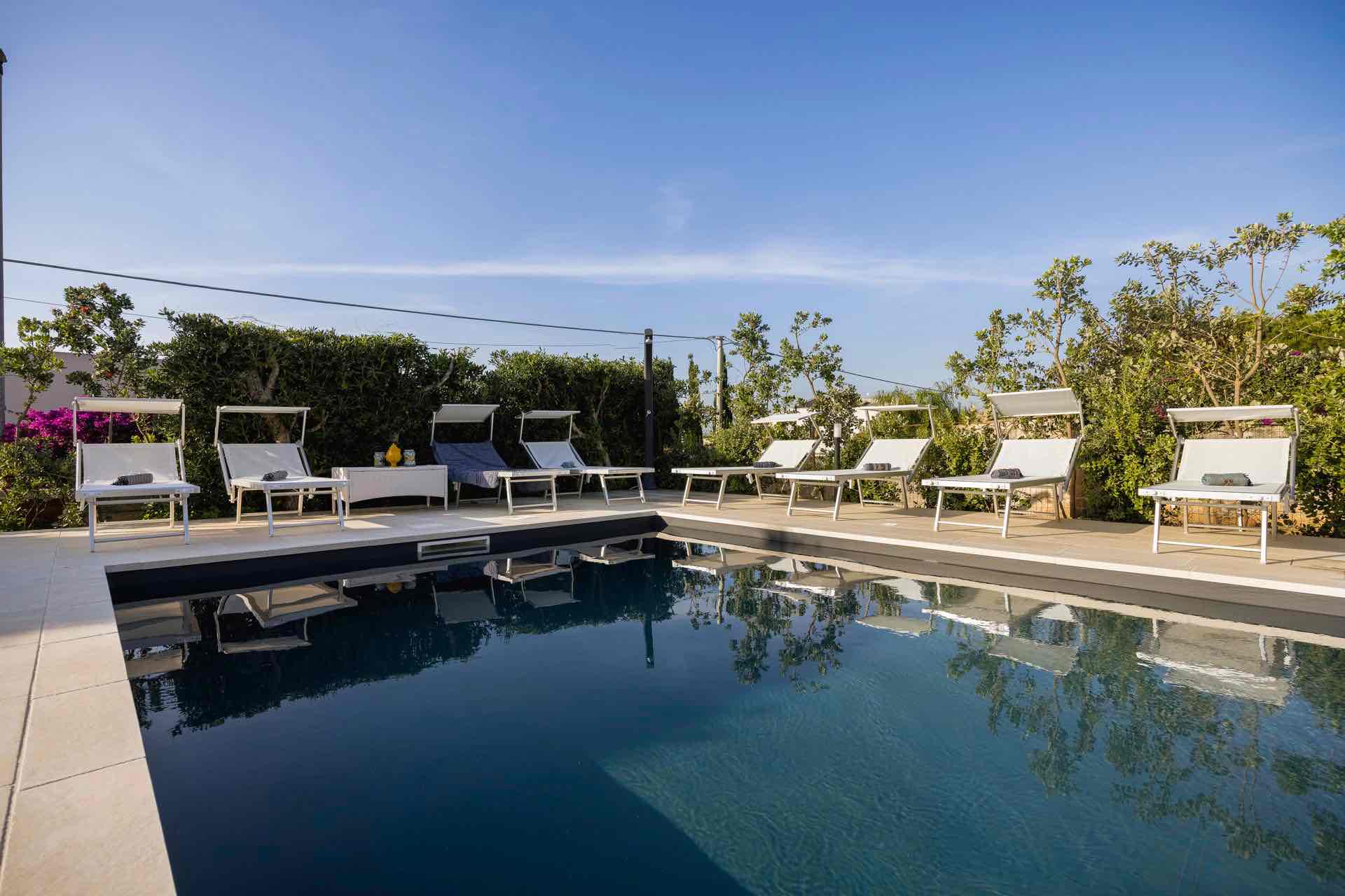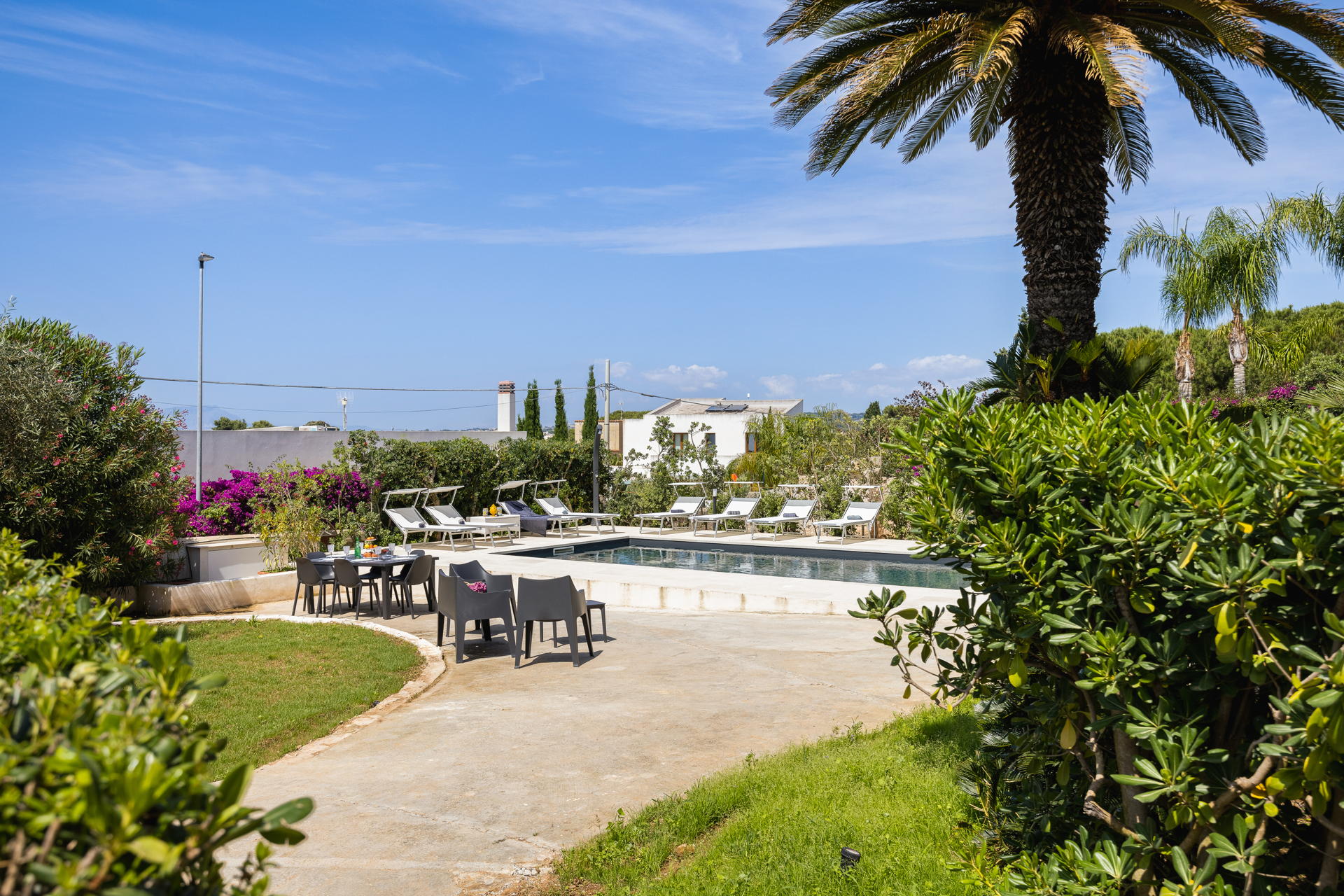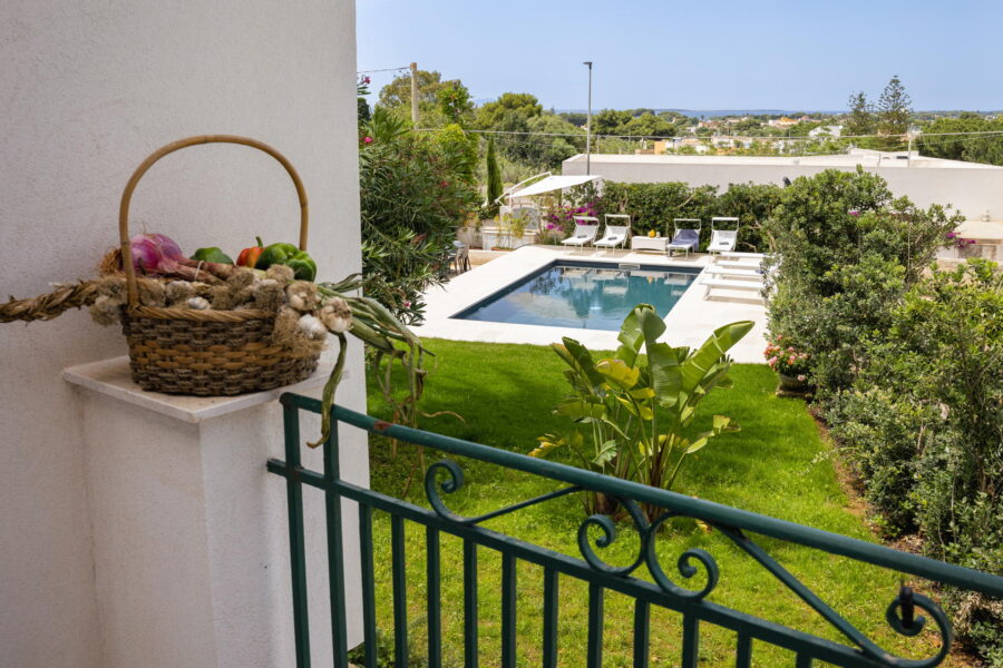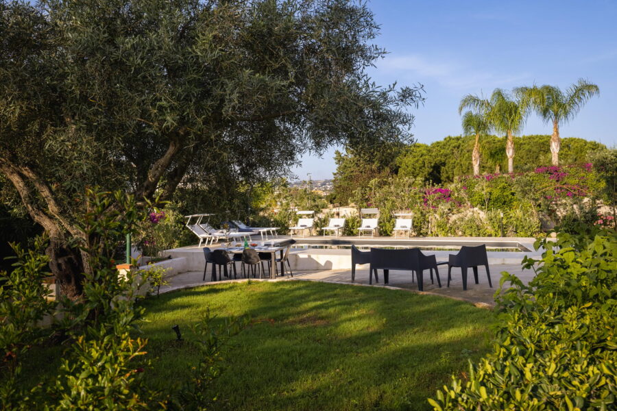The refined salt pool, with the beautiful lawn where one can enjoy the Sicilian sun, is located in the beautiful Italian garden, with palm trees and Mediterranean plants, and then the elegant staircase leading to the small balcony, with splendid majolica tiles, from which one enters the living room.