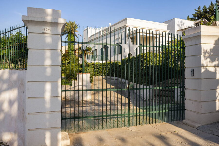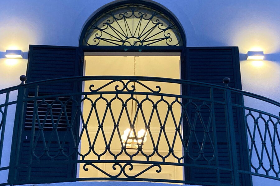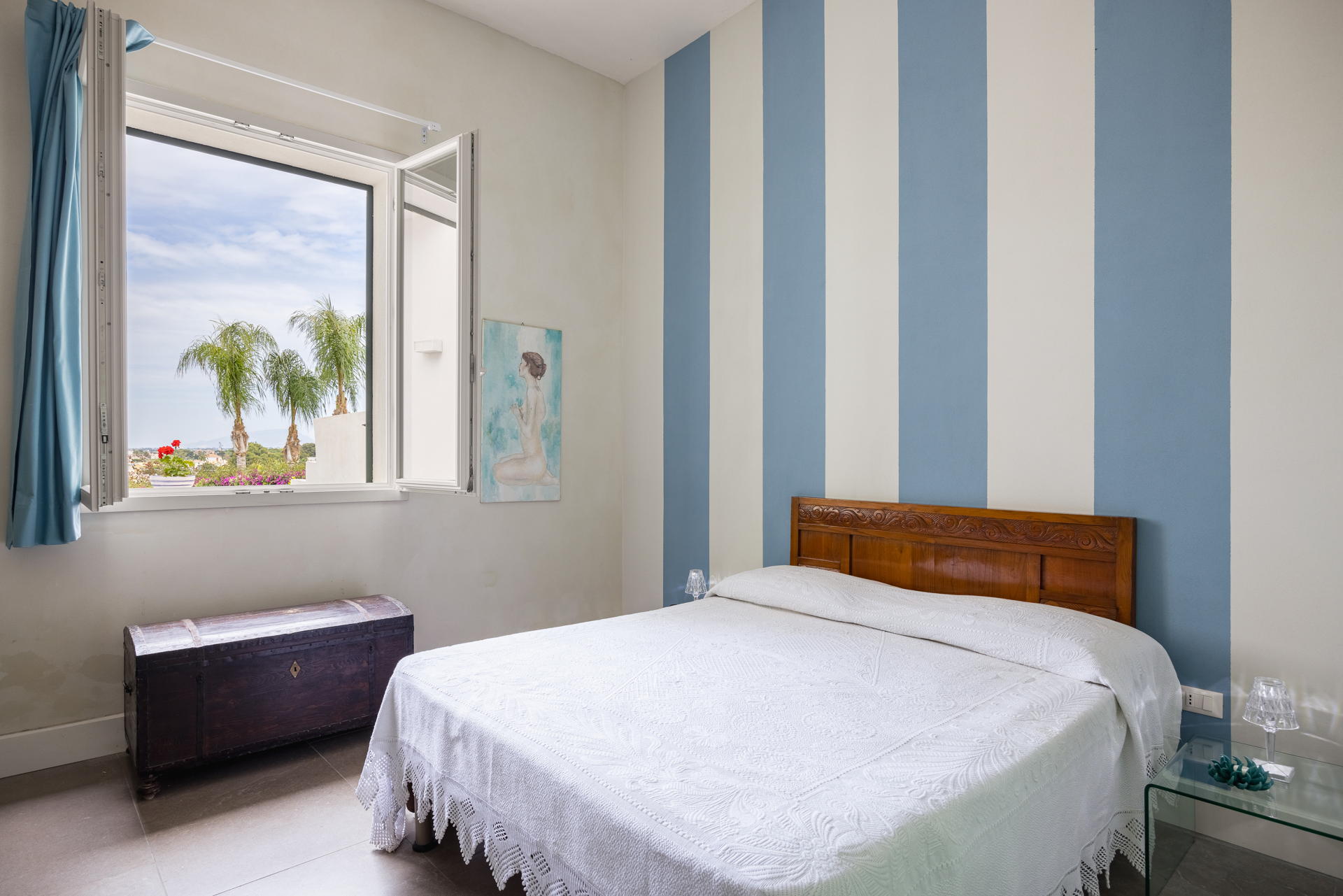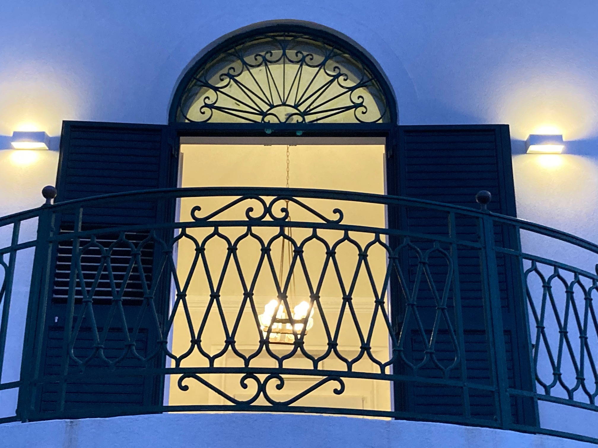 The refined salt pool, with the beautiful lawn where one can enjoy the Sicilian sun, is located in the beautiful Italian garden, with palm trees and Mediterranean plants, and then the elegant staircase leading to the small balcony, with splendid majolica tiles, from which one enters the living room.