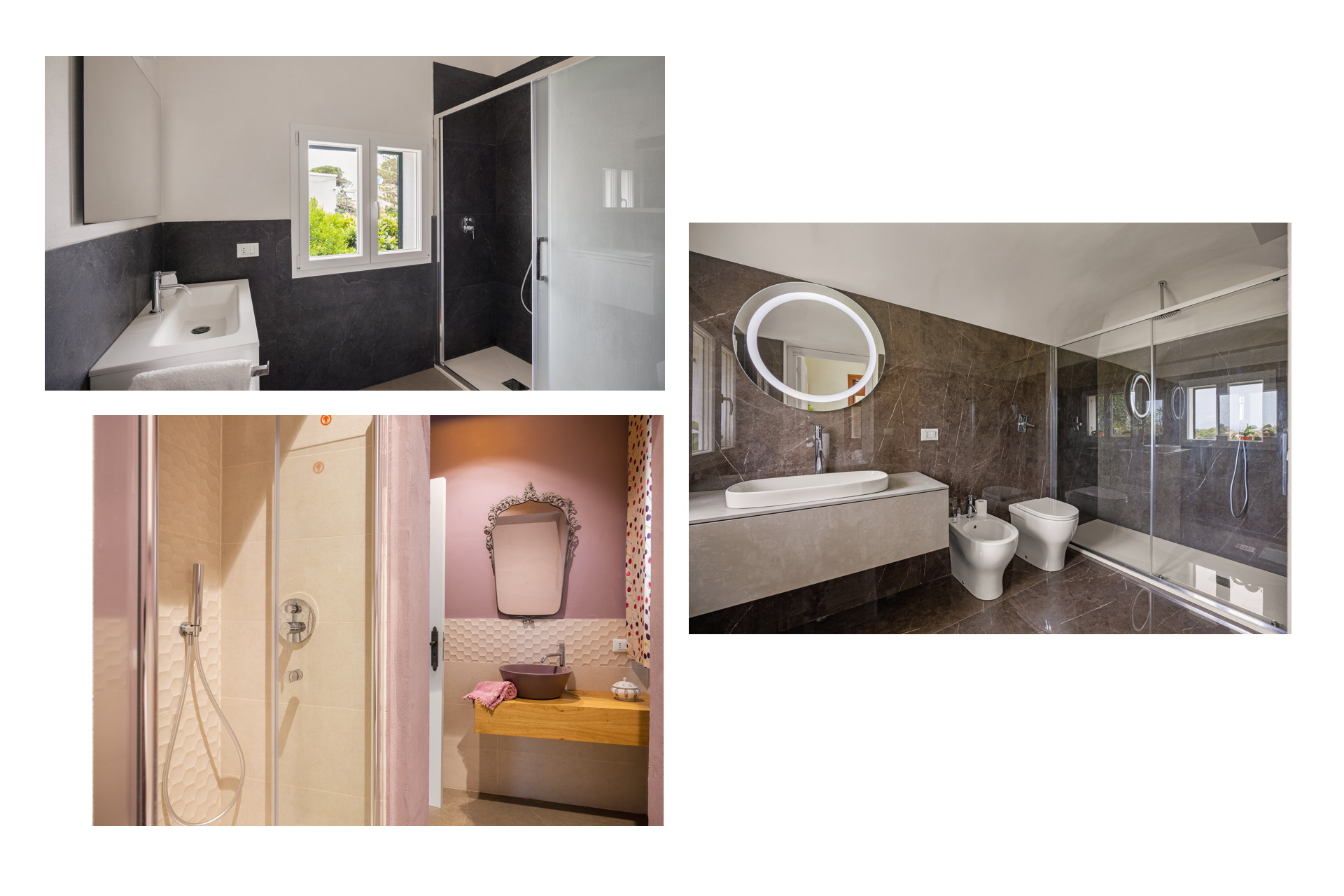 On the first floor, there are two elegant double bedrooms with en-suite bathrooms, another double bedroom, a twin bedroom with a delightful little balcony where you can perhaps enjoy an inviting morning breakfast, a shared bathroom, and, finally, a modern, well-equipped kitchen with a small veranda overlooking the garden.