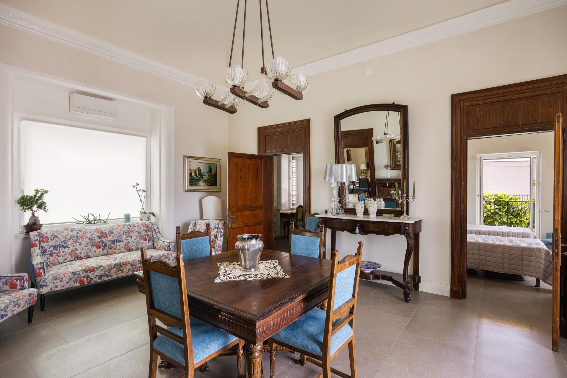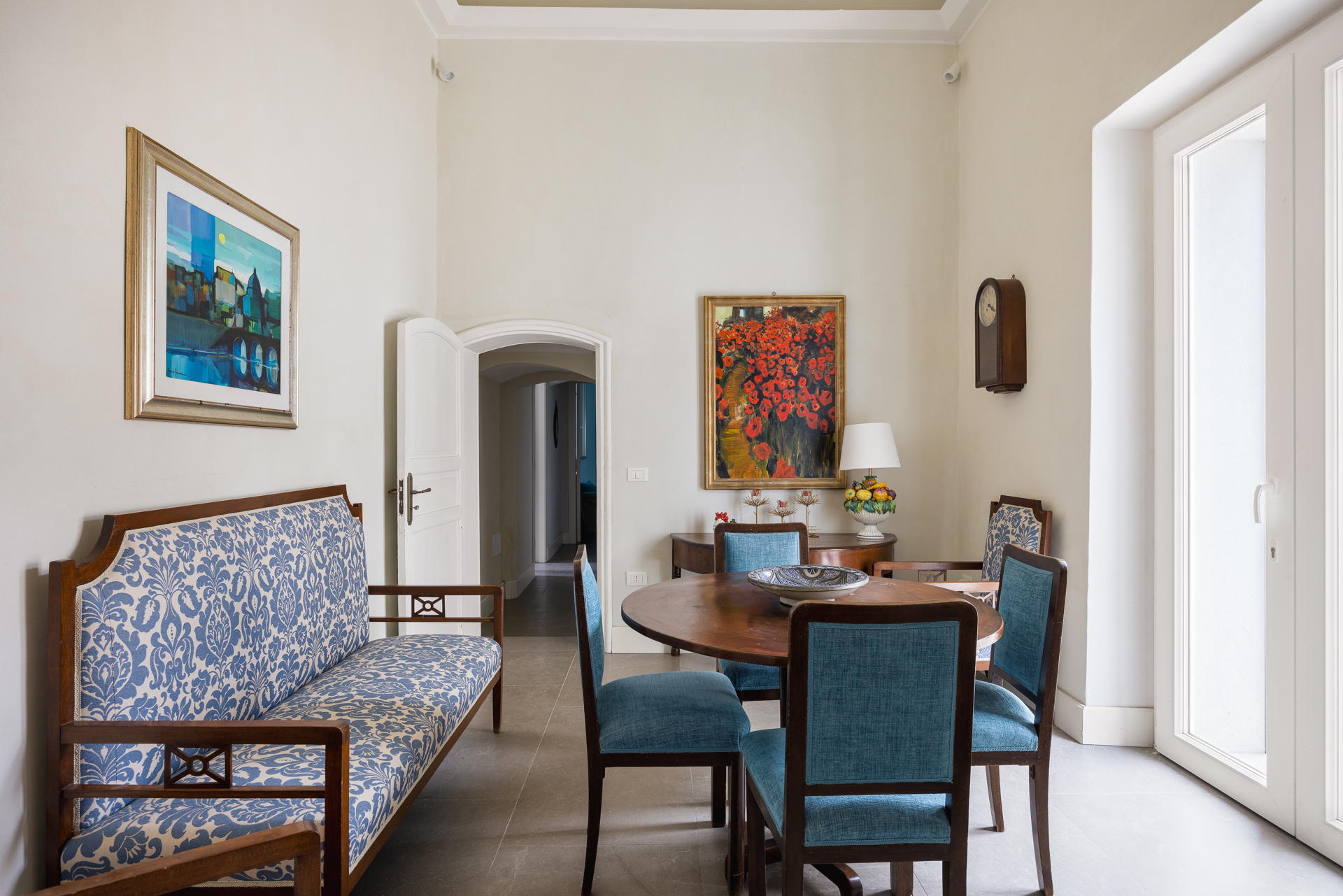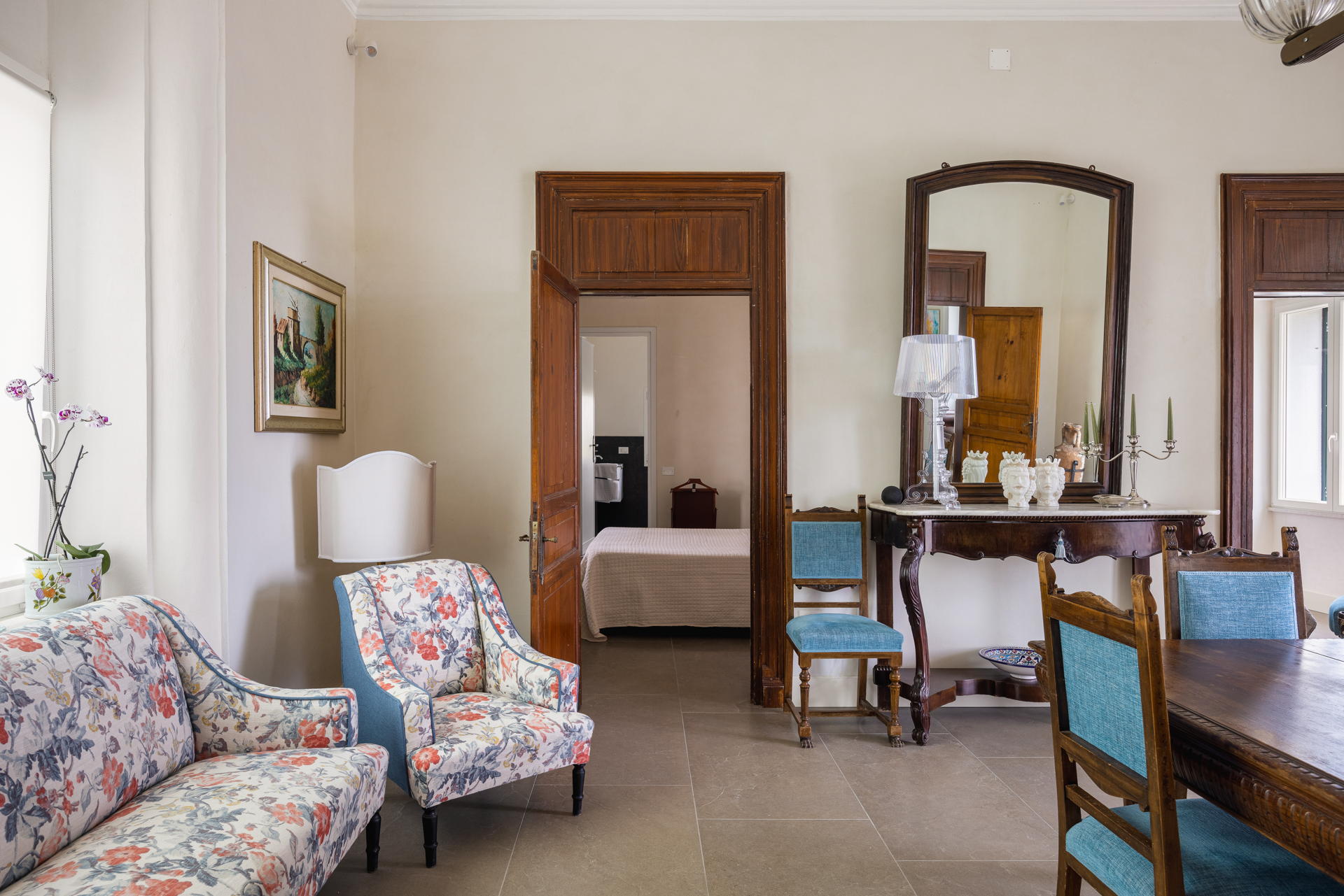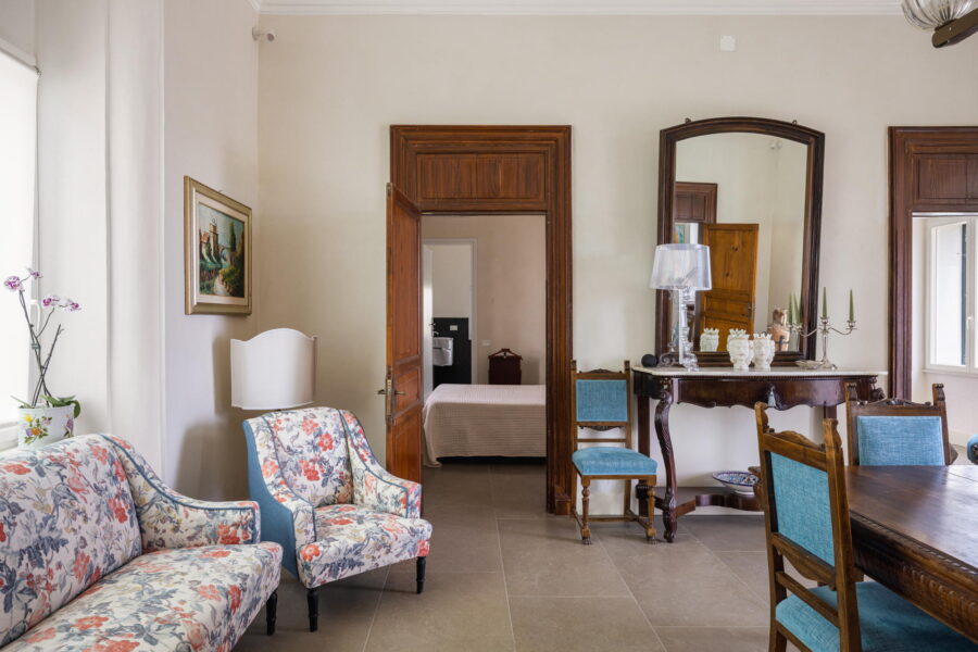 The living room is the pivot around which the other rooms revolve – a hallmark of the prestigious Sicilian residences of the nineteenth and twentieth centuries, it is a finely furnished space, with period furniture, very airy, thanks to the high barrel vault, and with a lovely view of the outside, towards the blue sky.