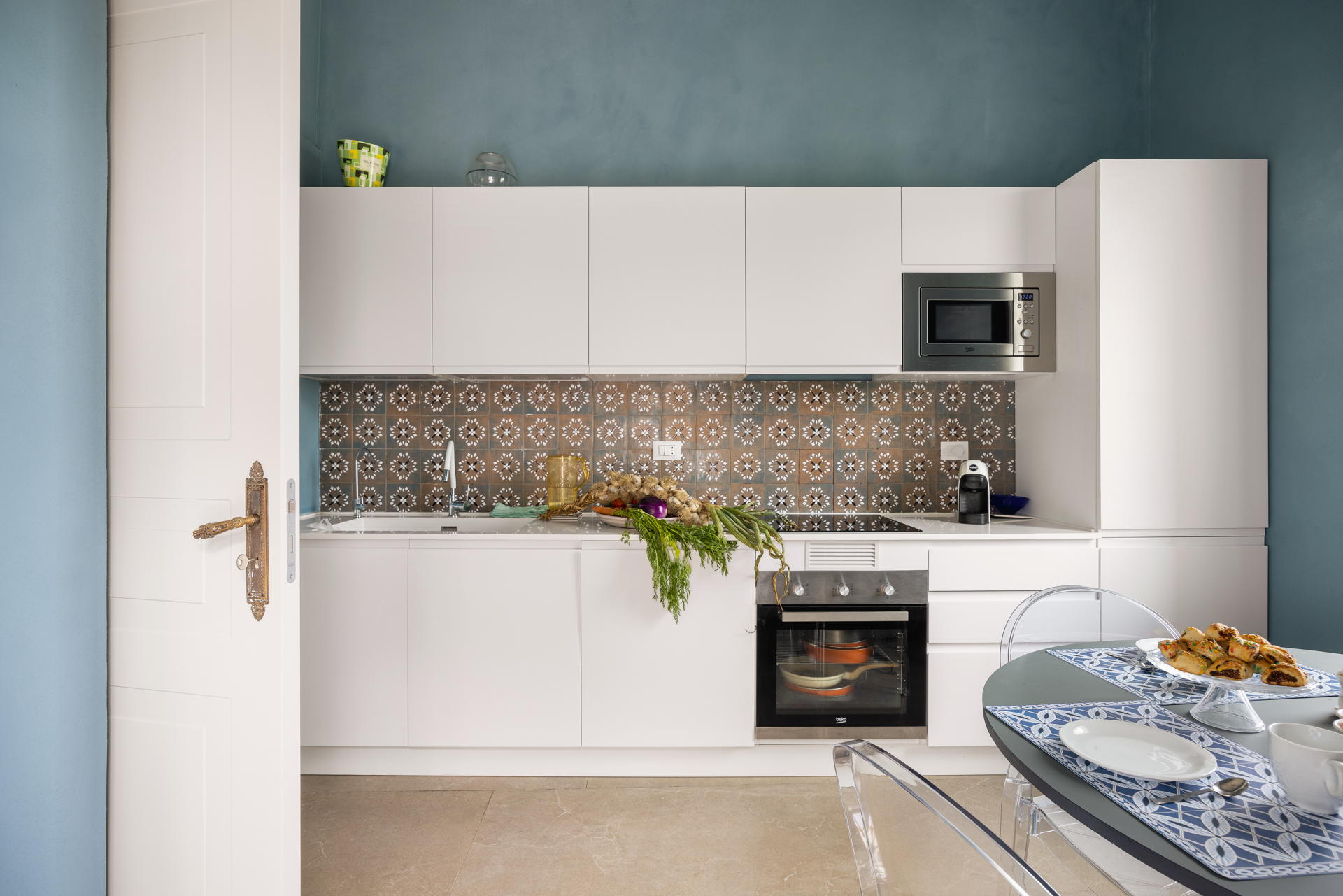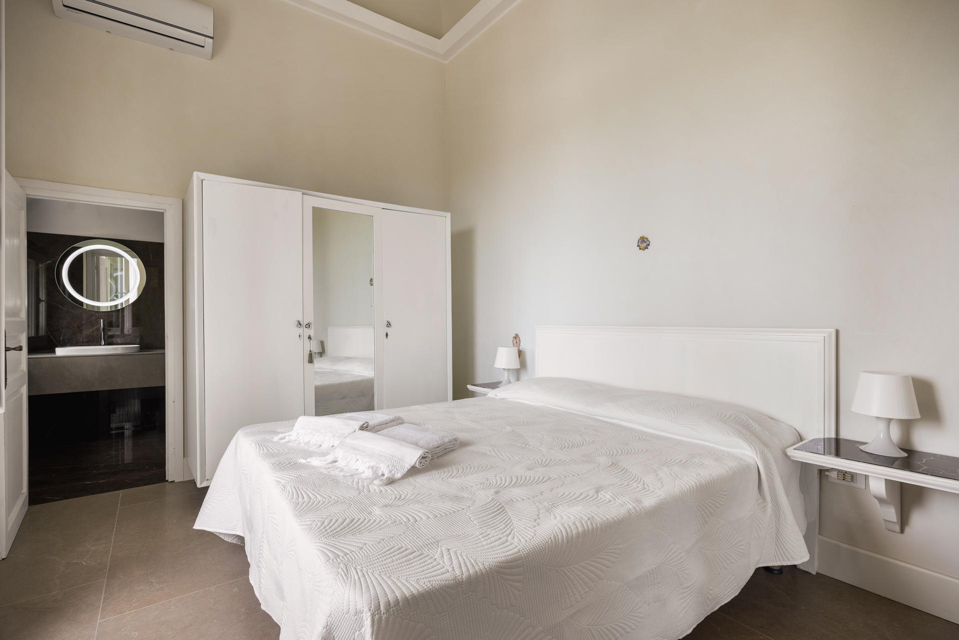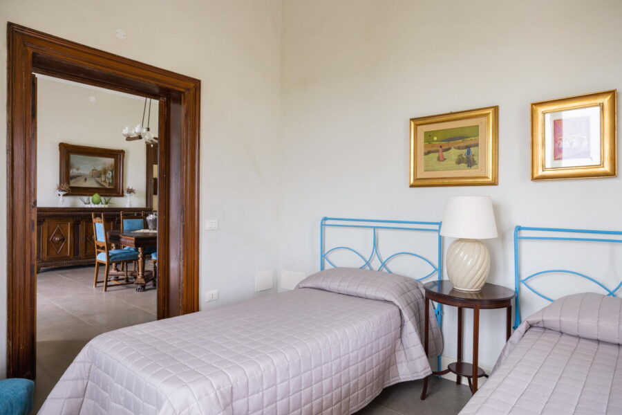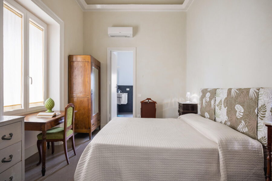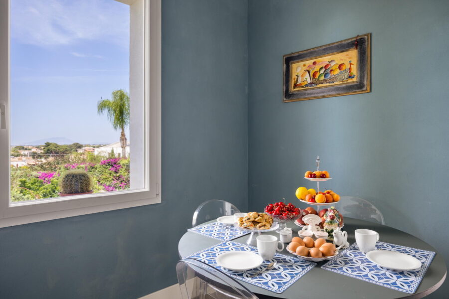The living room is the pivot around which the other rooms revolve – a hallmark of the prestigious Sicilian residences of the nineteenth and twentieth centuries, it is a finely furnished space, with period furniture, very airy, thanks to the high barrel vault, and with a lovely view of the outside, towards the blue sky.