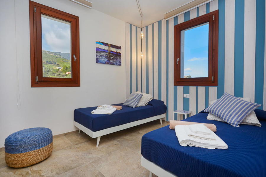With enough space for 8 people, the villa is ideal for a family or couples. On the ground floor, you’ll find a living-dining room with a well-equipped kitchen. On the same floor, there are two bedrooms: a double room with direct access to the pool and a twin (can be made into a double), which share a bathroom with shower.