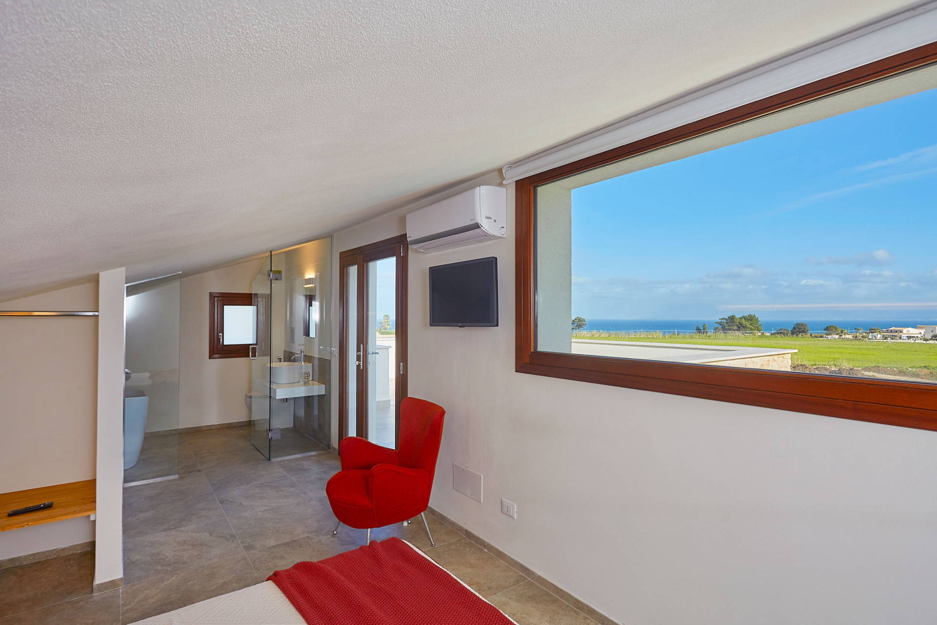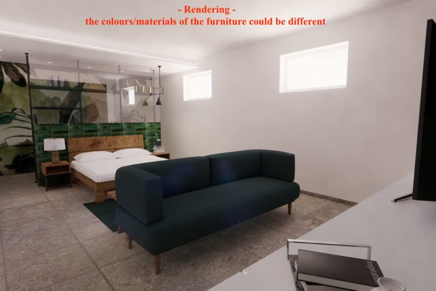 Access to the first floor is via a separate external stairway. Guests in the spacious double bedroom can enjoy complete privacy as well as an en-suite bathroom with shower. The bedroom opens out on to an elegant furnished terrace with breath-taking views – a wonderful spot to relax together with a glass of wine!
